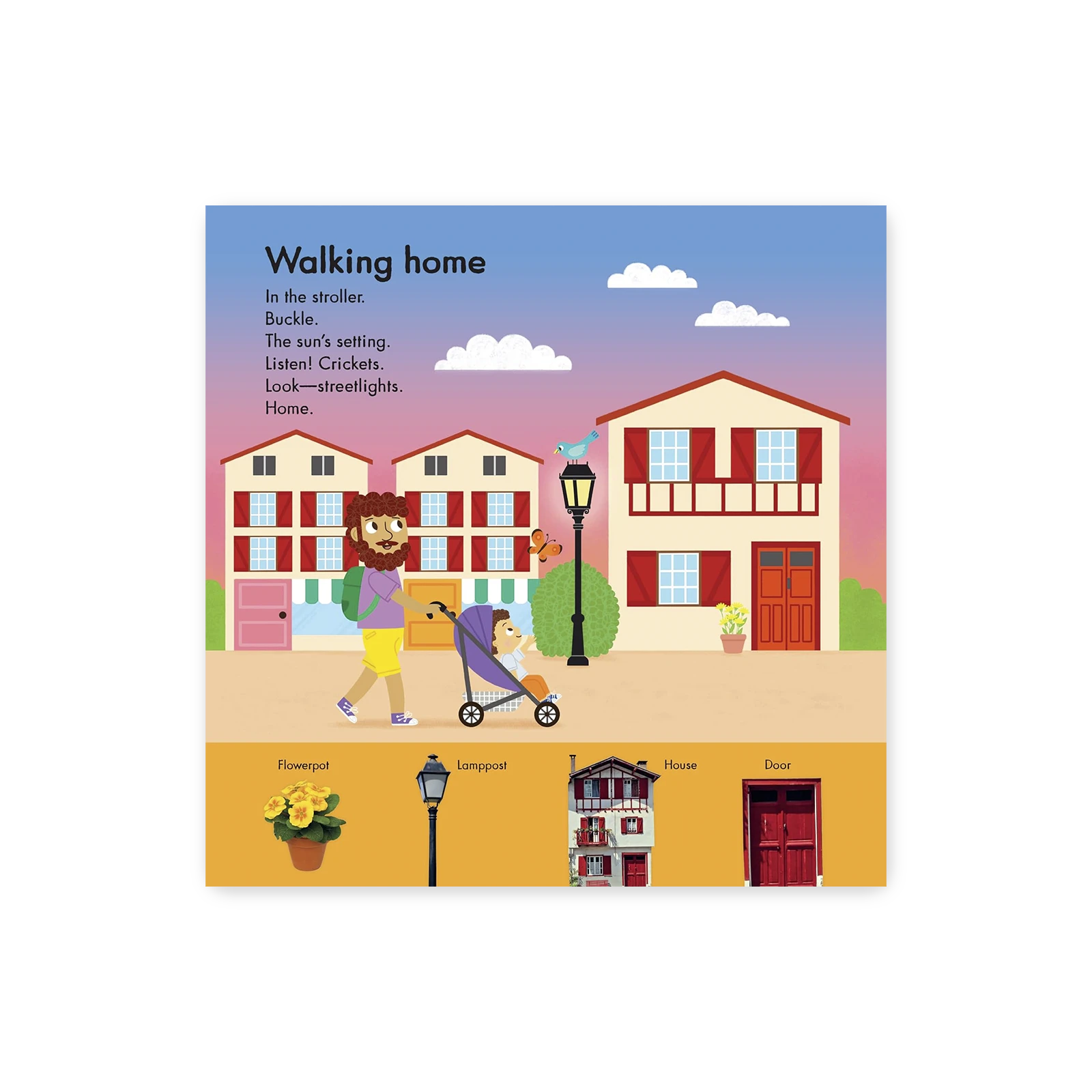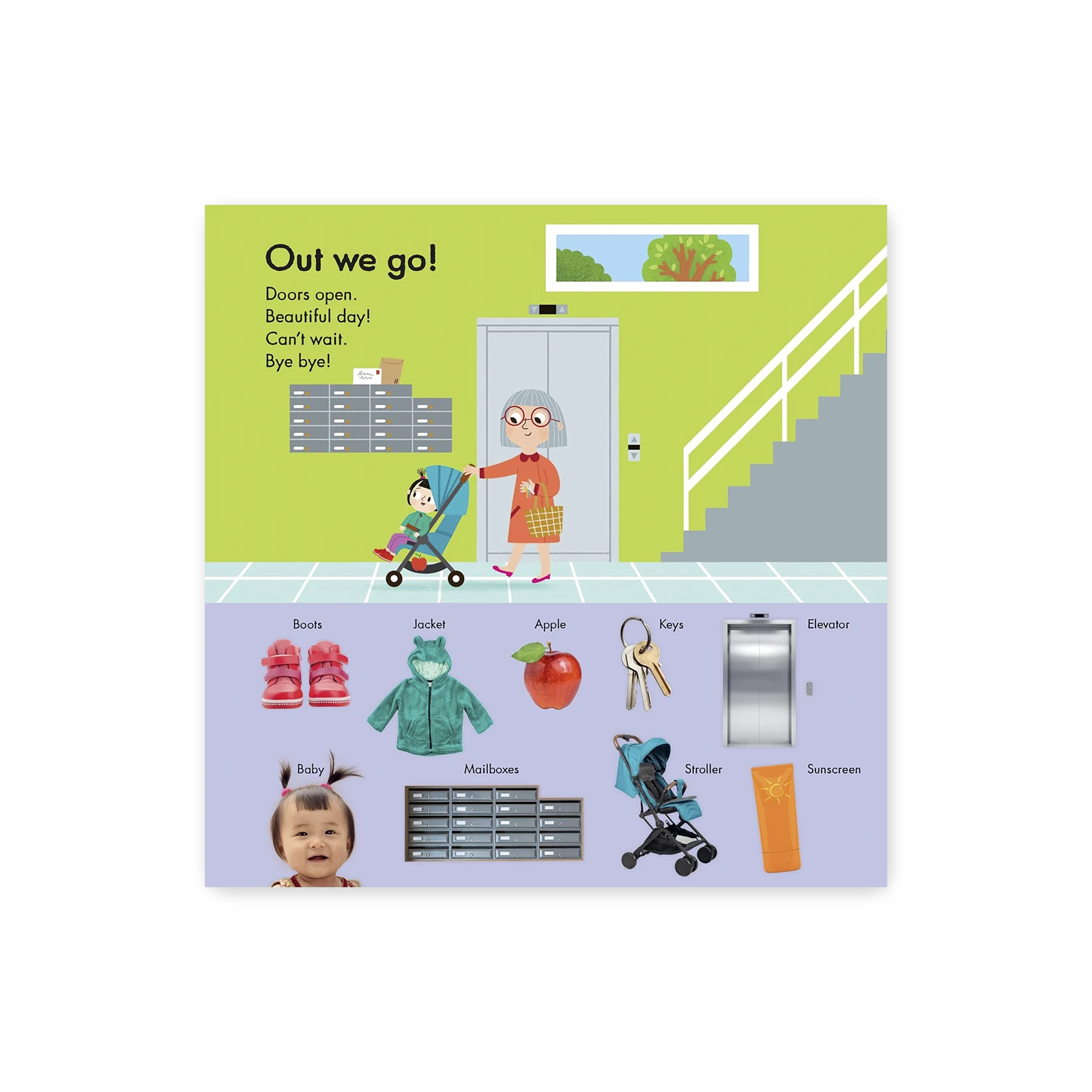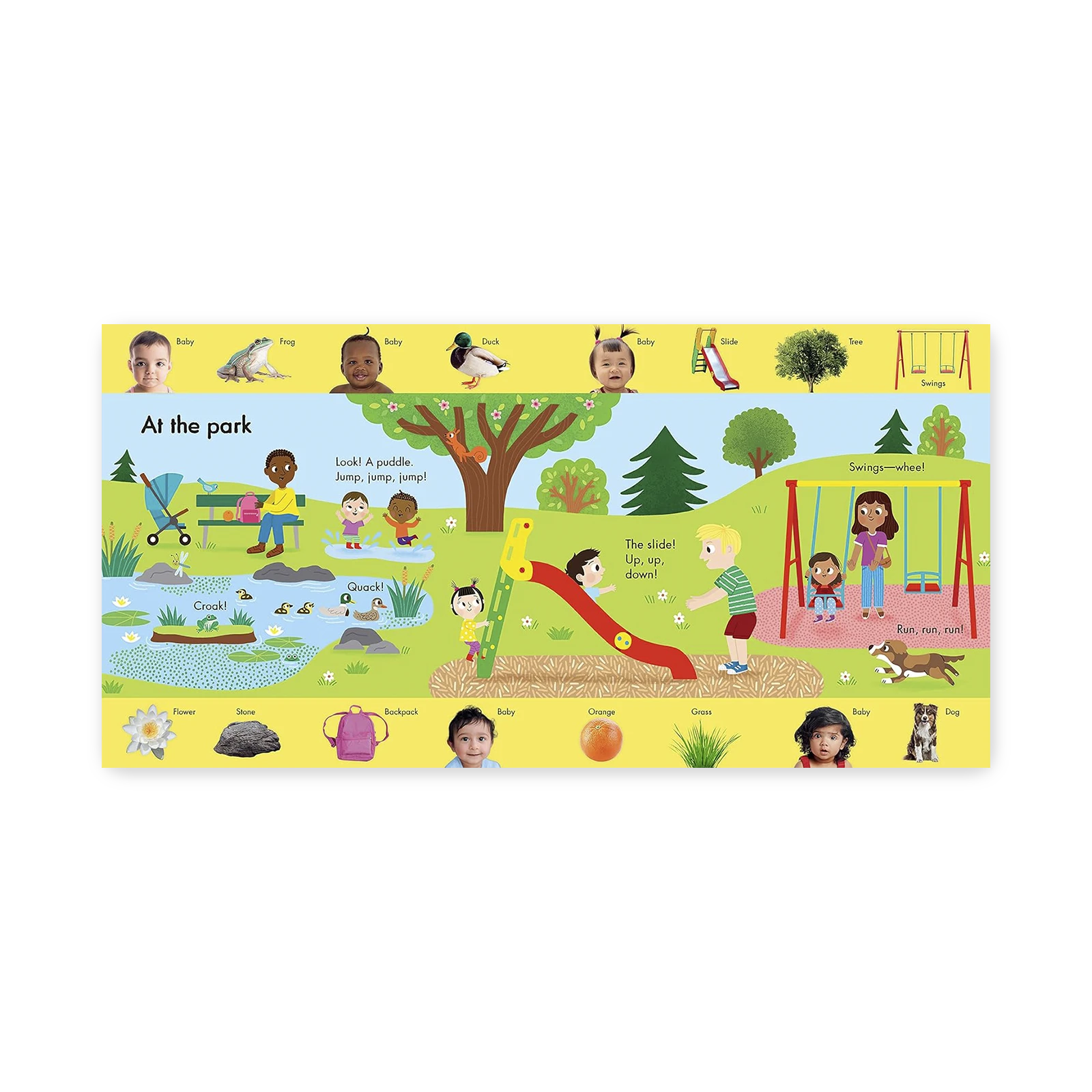 This engaging large-format board book encourages toddlers’ language learning through the repetition of simple words and phrases for everyday objects and activities. Each illustrated spread also includes photographs of babies and everyday objects drawn into the art – creating a search-and-find on every page to allow more time for parents and babies to connect.