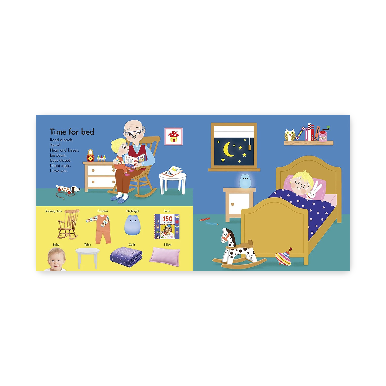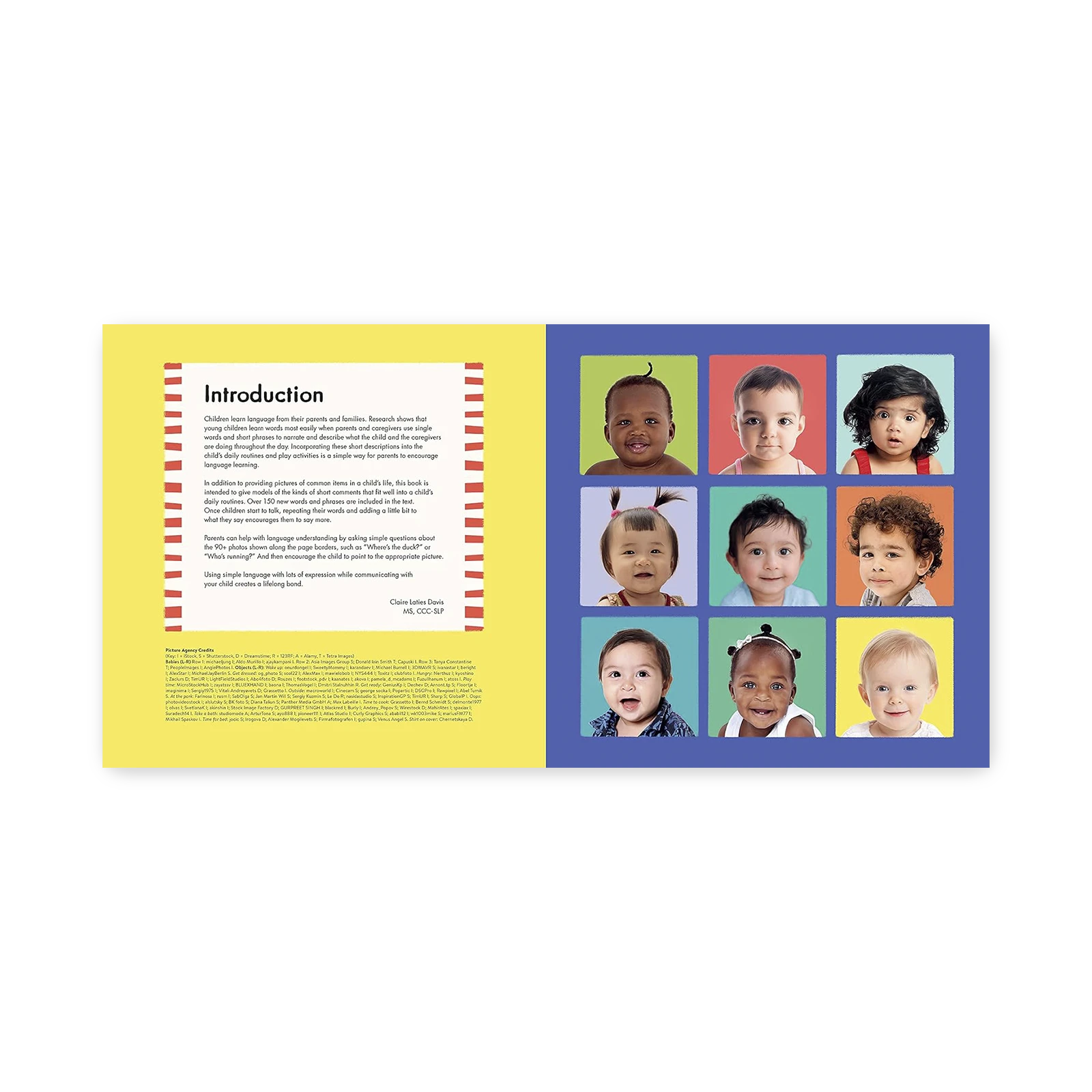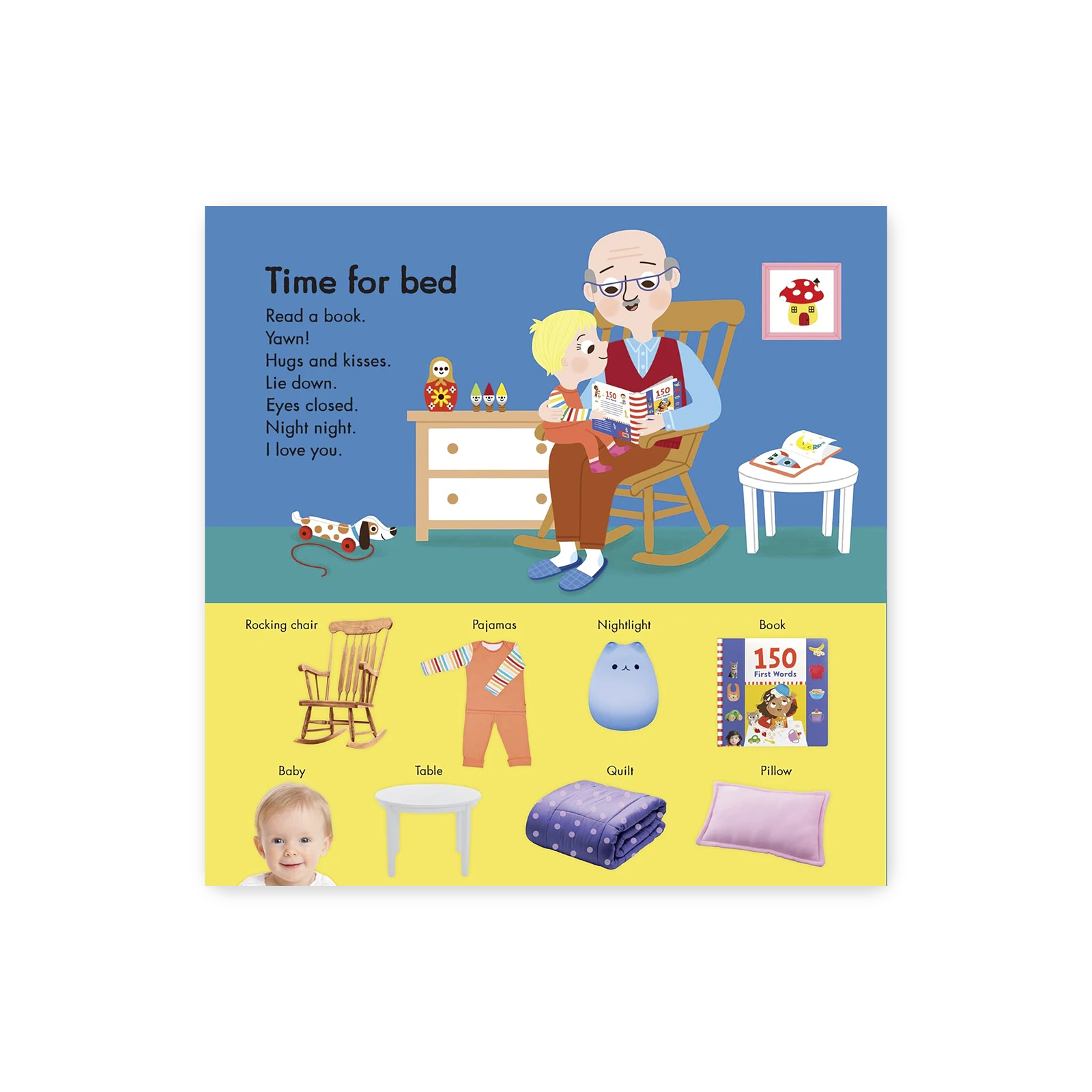 This engaging large-format board book encourages toddlers’ language learning through the repetition of simple words and phrases for everyday objects and activities. Each illustrated spread also includes photographs of babies and everyday objects drawn into the art – creating a search-and-find on every page to allow more time for parents and babies to connect.