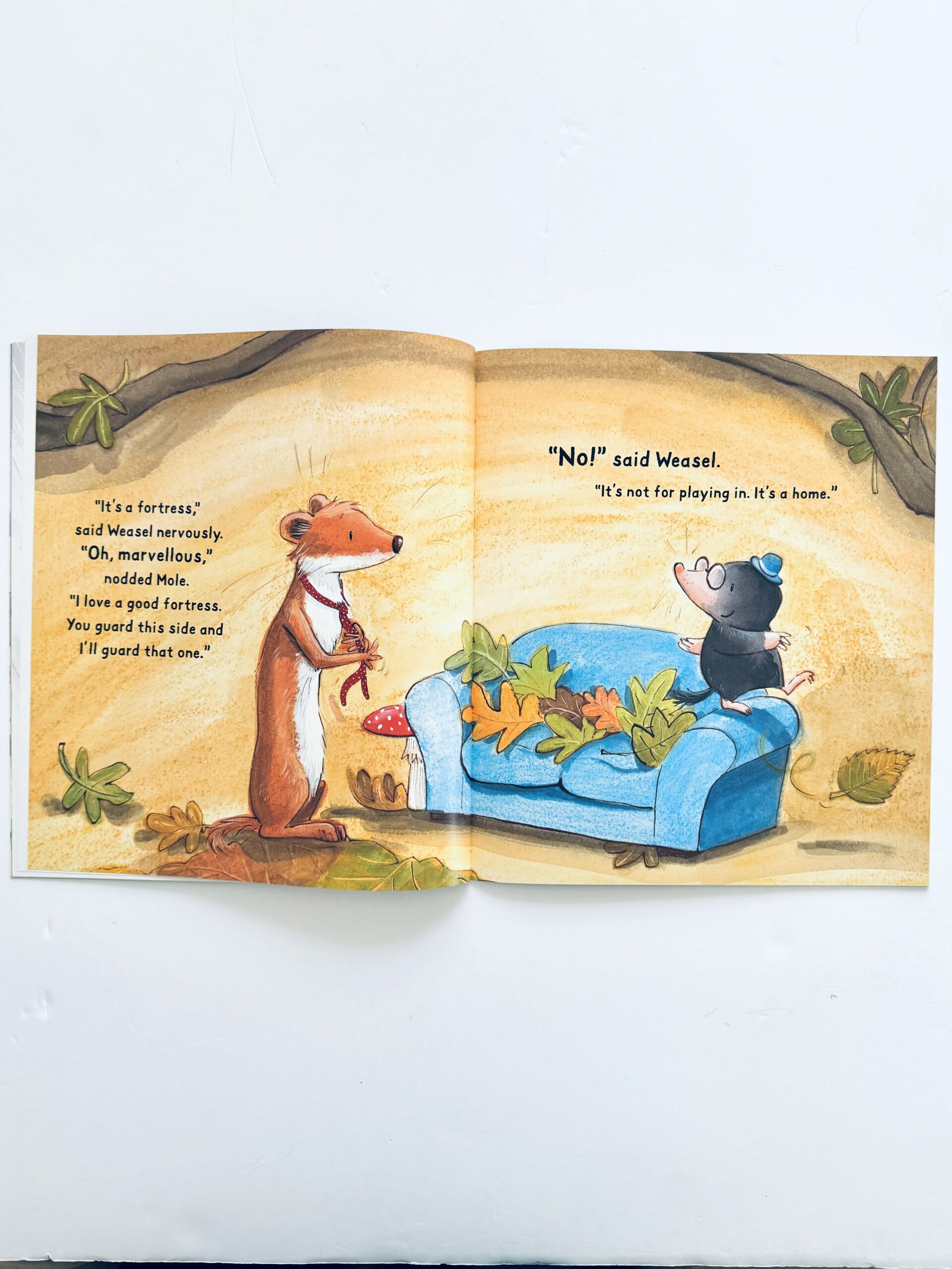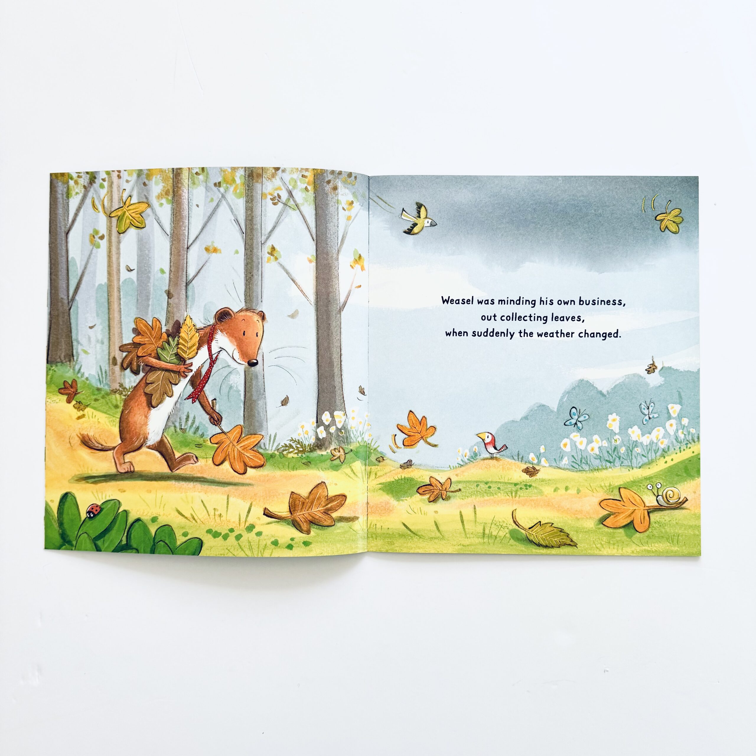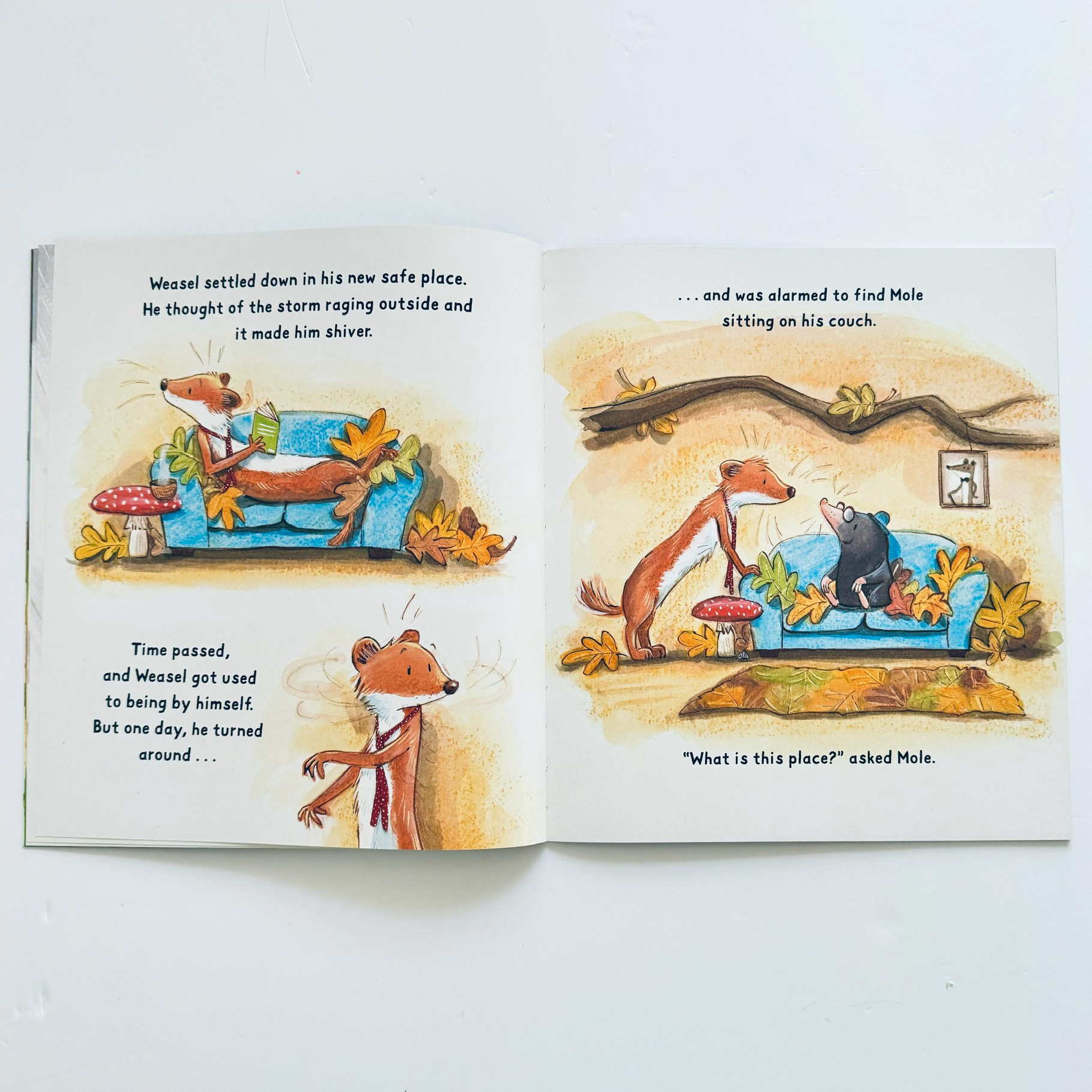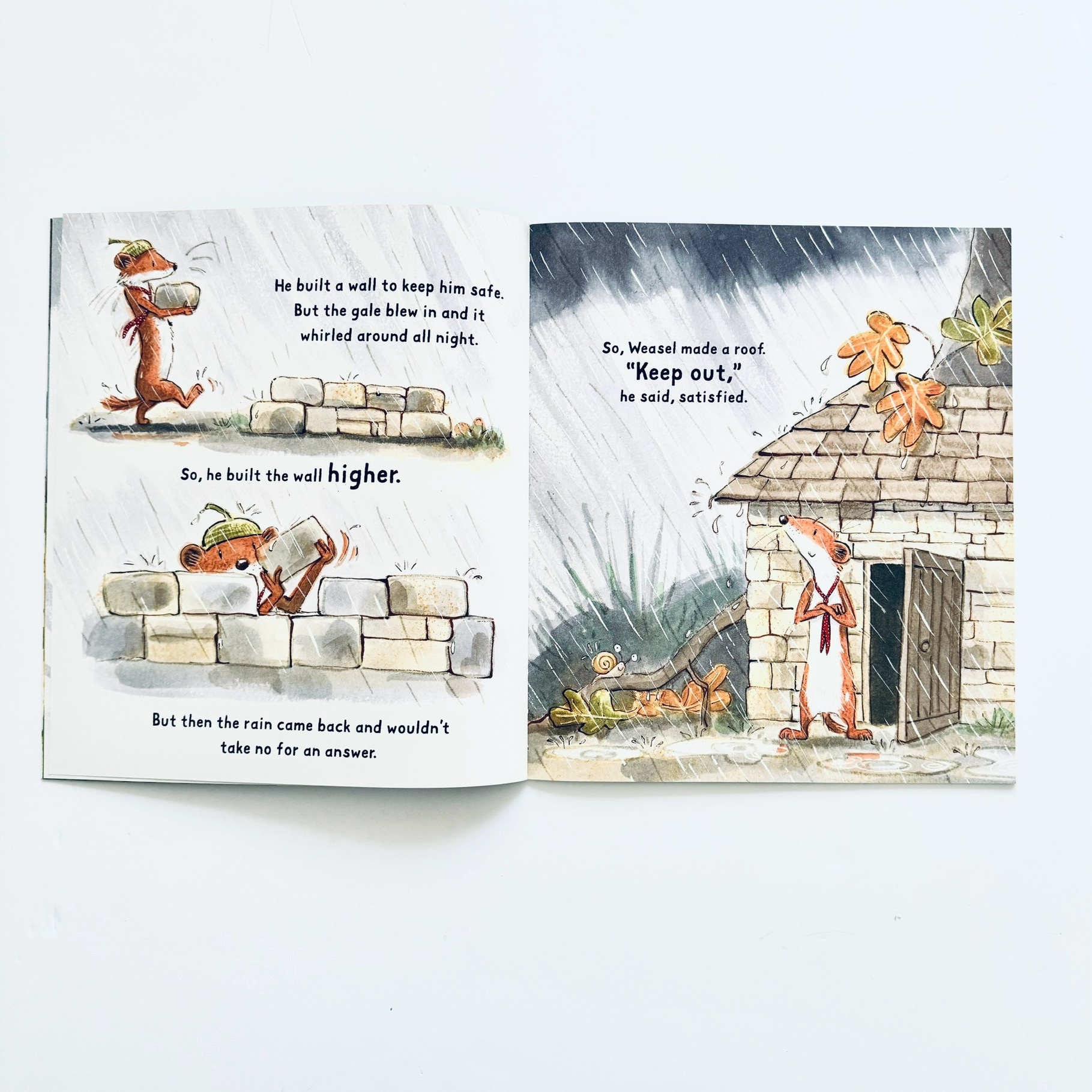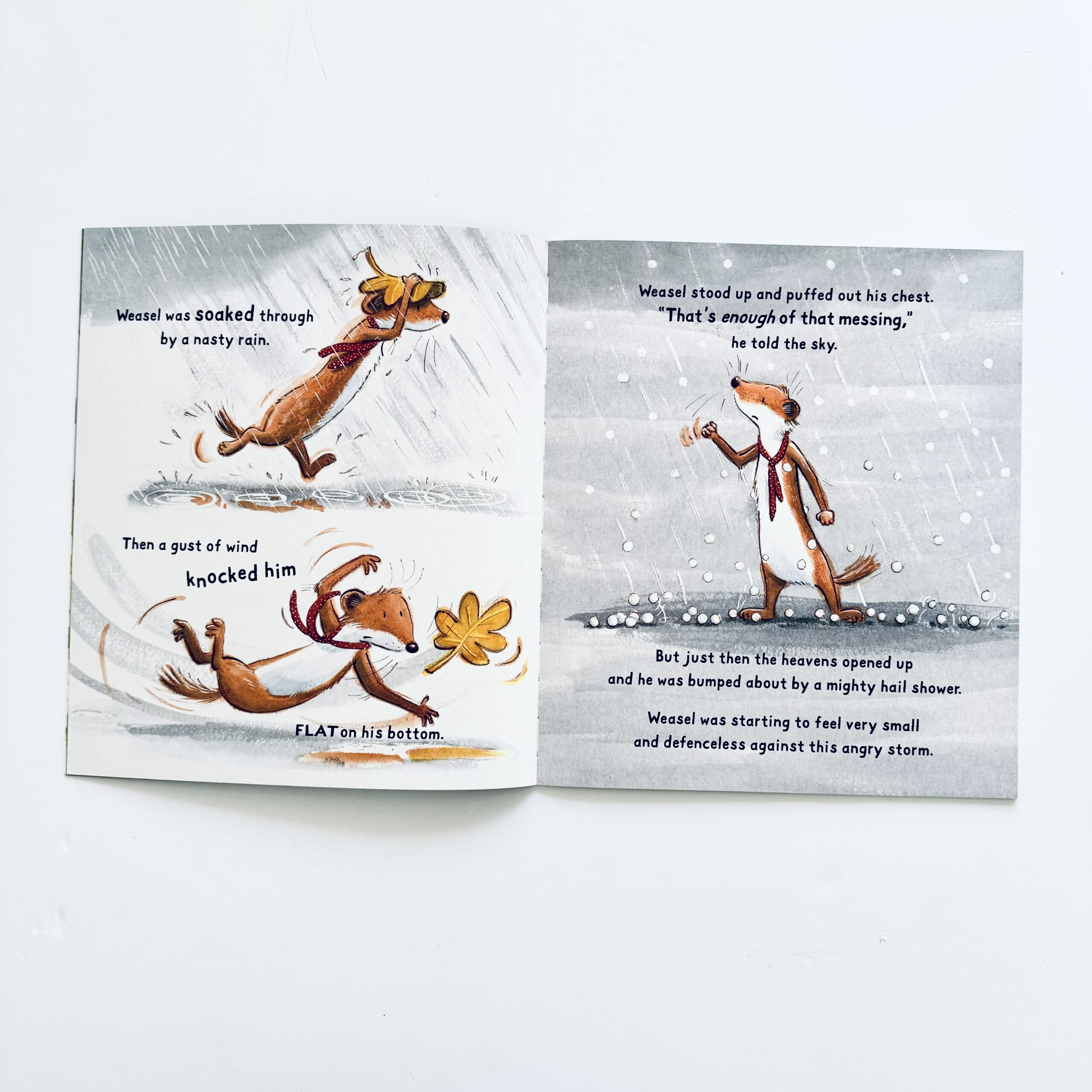 Gdy Weasel wpada w panikę podczas wielkiej burzy buduje fortecę, by się w niej ukryć. Spotyka jednak Mole’a, który uwielbia bawić się na wietrze i chlapać w deszczu. Czy Weasel nauczy się przezwyciężać swoje lęki i odnajdywać radość bez względu na pogodę?