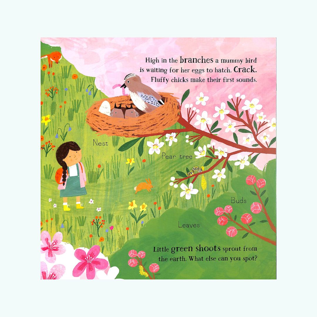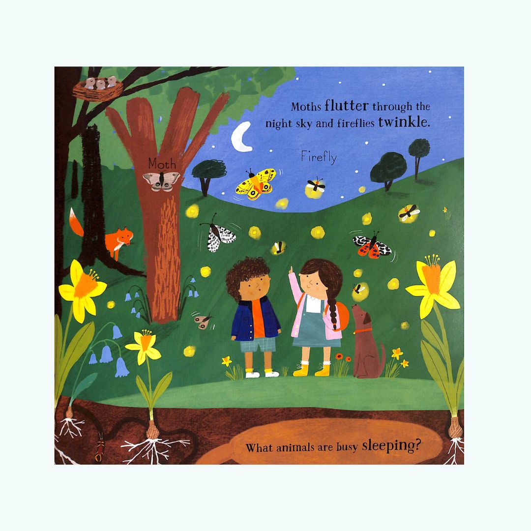Na każdej rozkładówce dzieci mogą wyszukiwać zwierzęta, owady, drzewa, liście i kwiaty – każda pora roku odkrywa nowe sceny i detale, które można wspólnie obserwować i omawiać.