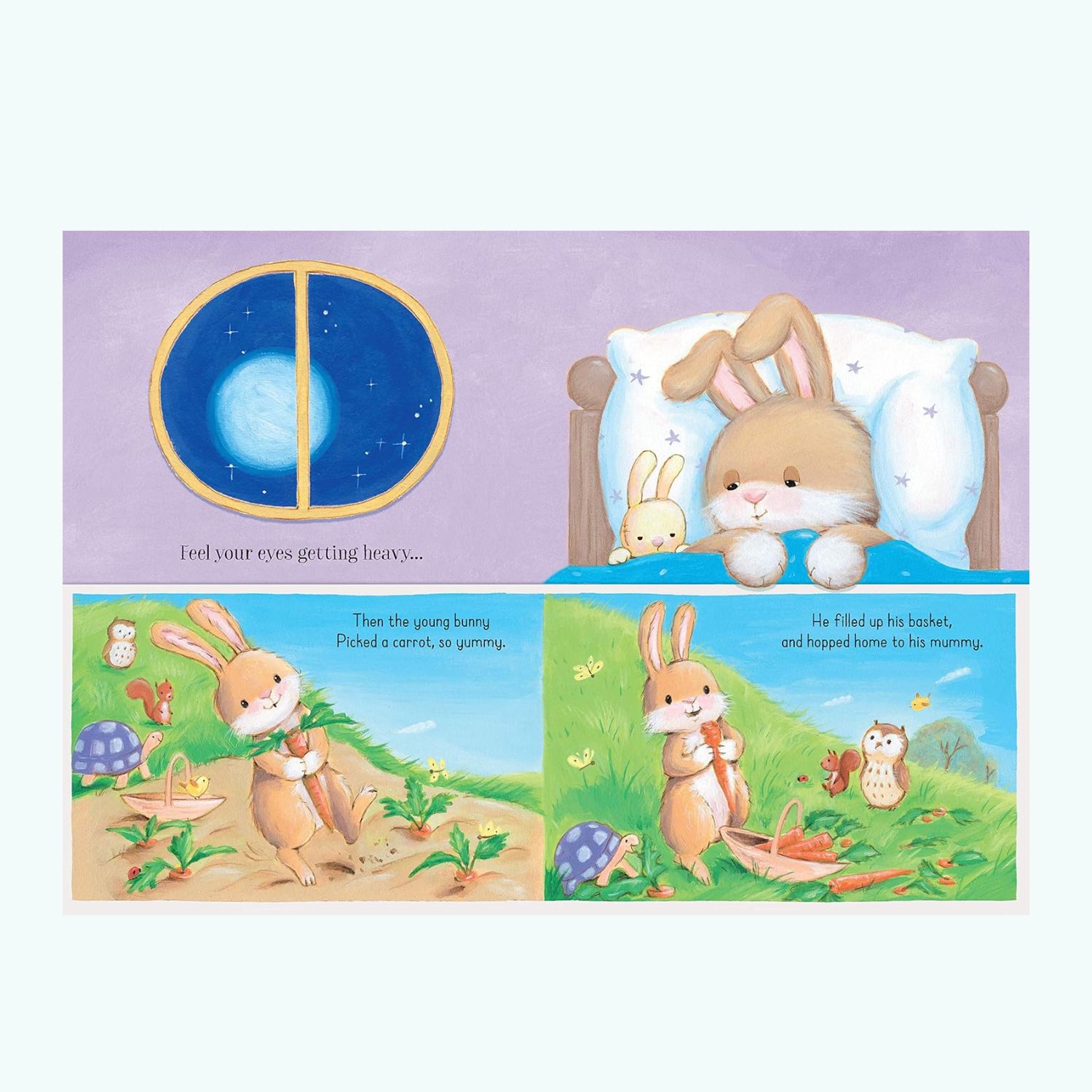 Książka wyróżnia się nietypowym, „opowieścią w opowieści” – maluch może obserwować, jak króliczek zasypia podczas czytania. To świetny wybór jako pierwsza książeczka do wieczornego rytuału snu.