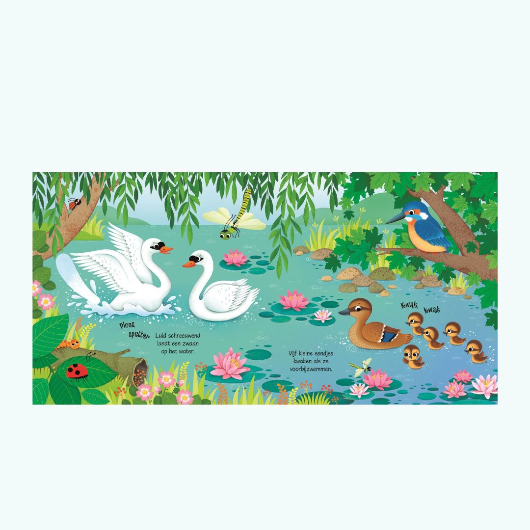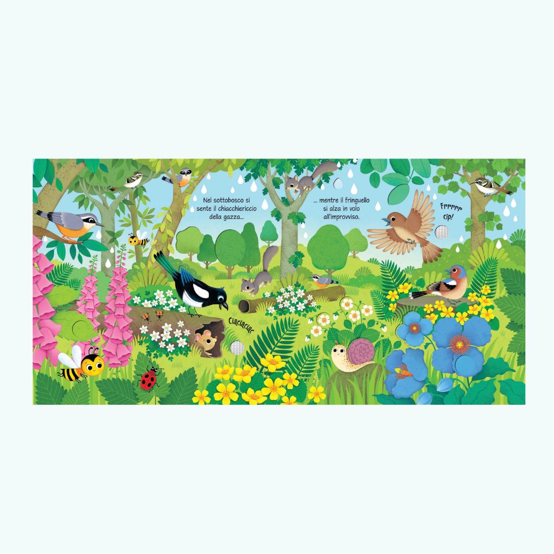 Little children will love hearing the birds sing as they press the pages of this enchanting book. Each beautifully illustrated scene has simple text and cut-out shapes to discover, and a sound button to press to hear different bird sounds including baby blackbirds tweeting, a magpie chattering, ducklings quacking and a cuckoo singing.