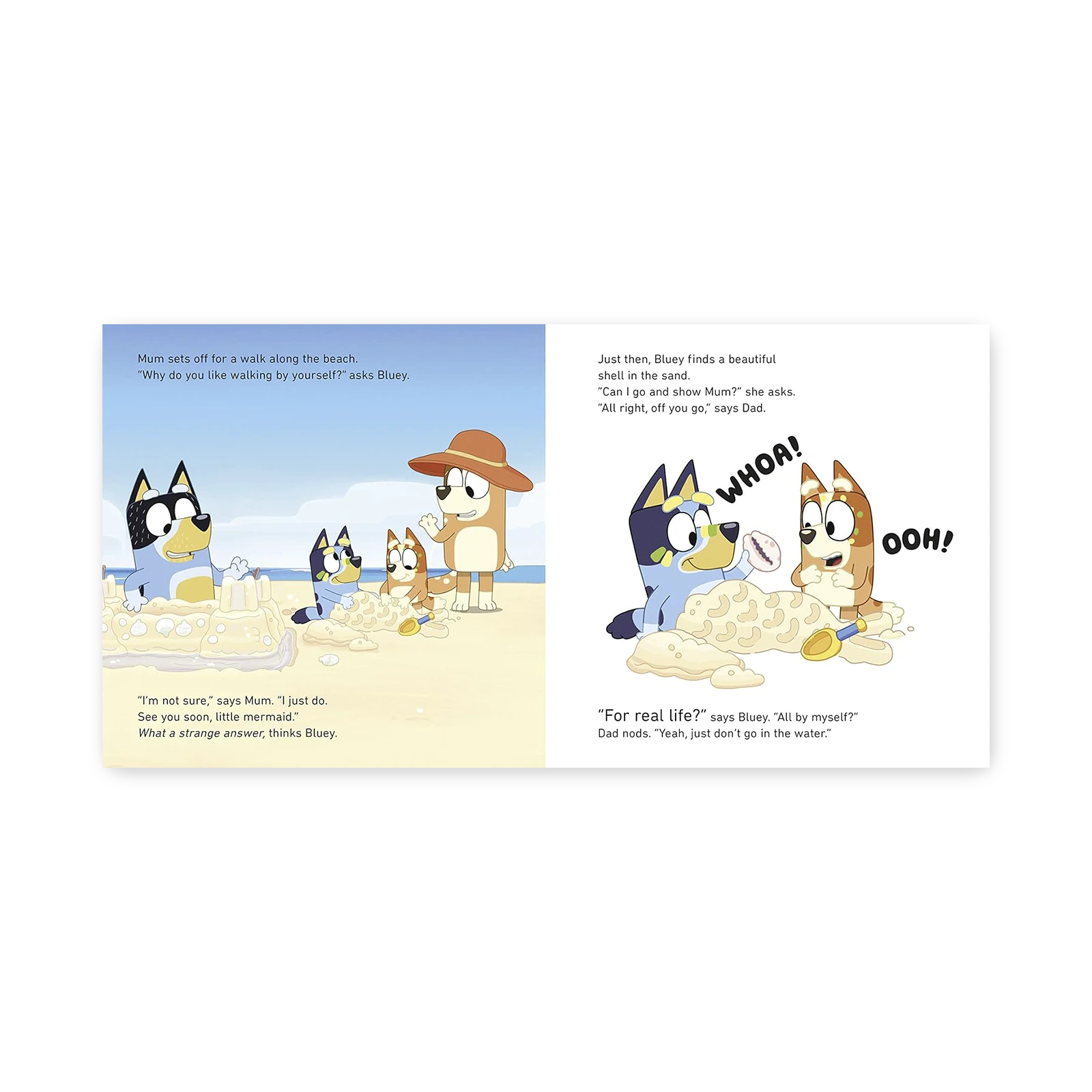 Bluey, Bingo, Mum and Dad are at the beach. While Mum is off for a walk, Bluey discovers a beautiful shell and runs to catch up with her.