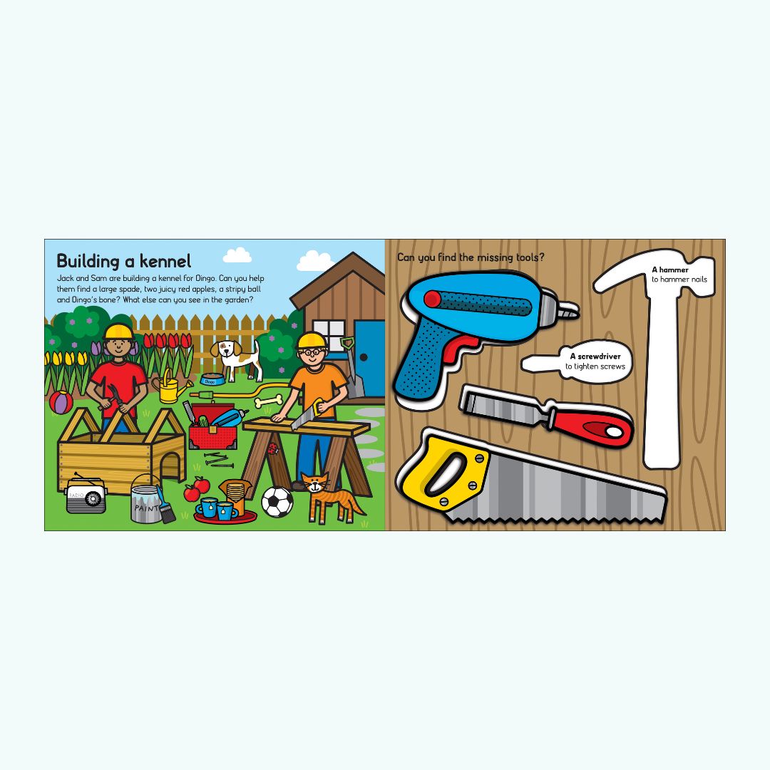 To doskonały sposób na naukę poprzez zabawę, który rozwija koordynację ręka-oko, pobudza wyobraźnię i uczy pierwszych słów po angielsku. Builder’s Tool Kit to książka, która zachwyci każdego małego majsterkowicza! 🛠️🚧
