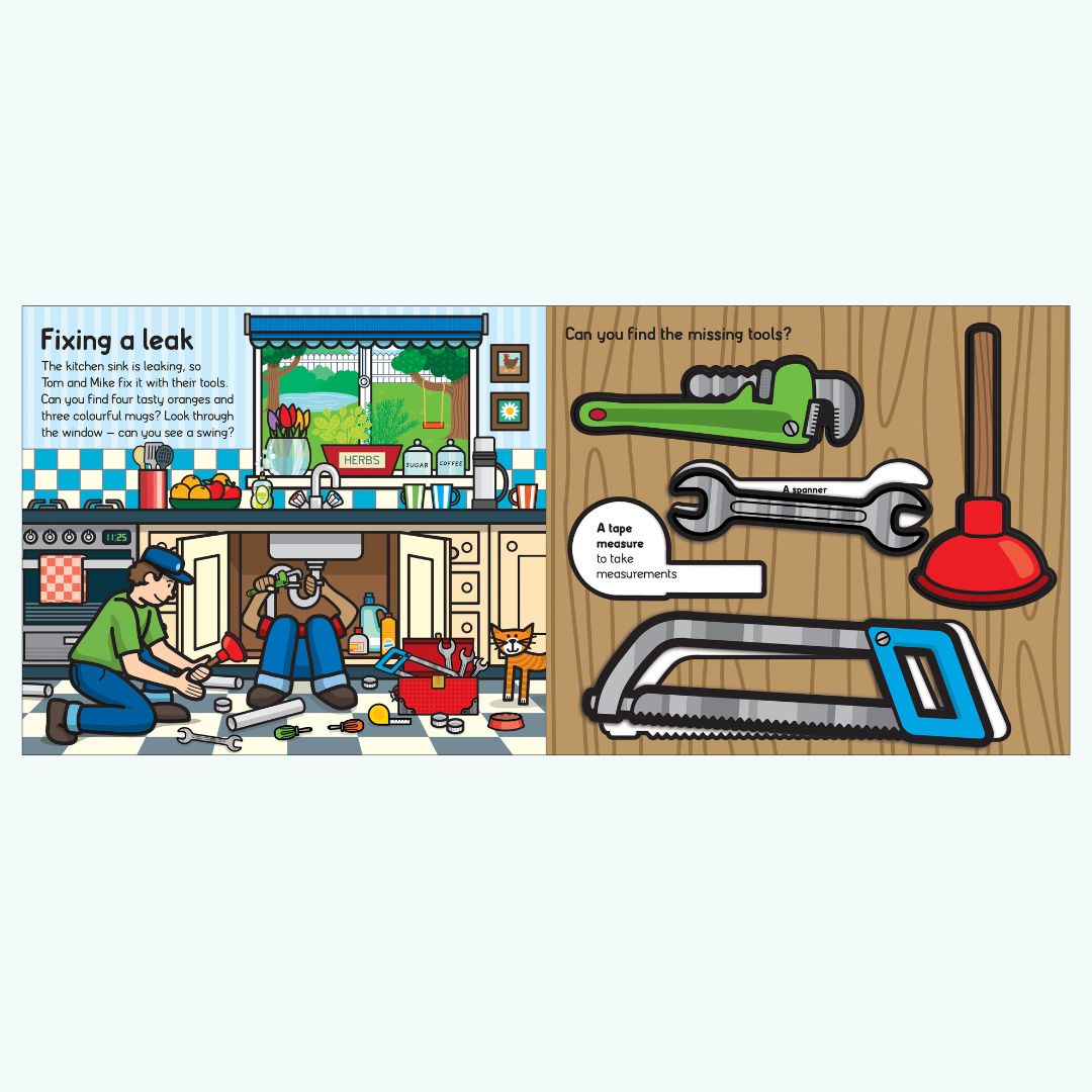 - Nietypowa, interaktywna forma – książka zawiera realistyczne puzzle w kształcie narzędzi, które dzieci mogą wyjmować i dopasowywać w odpowiednie miejsca, ćwicząc przy tym zręczność i logiczne myślenie.