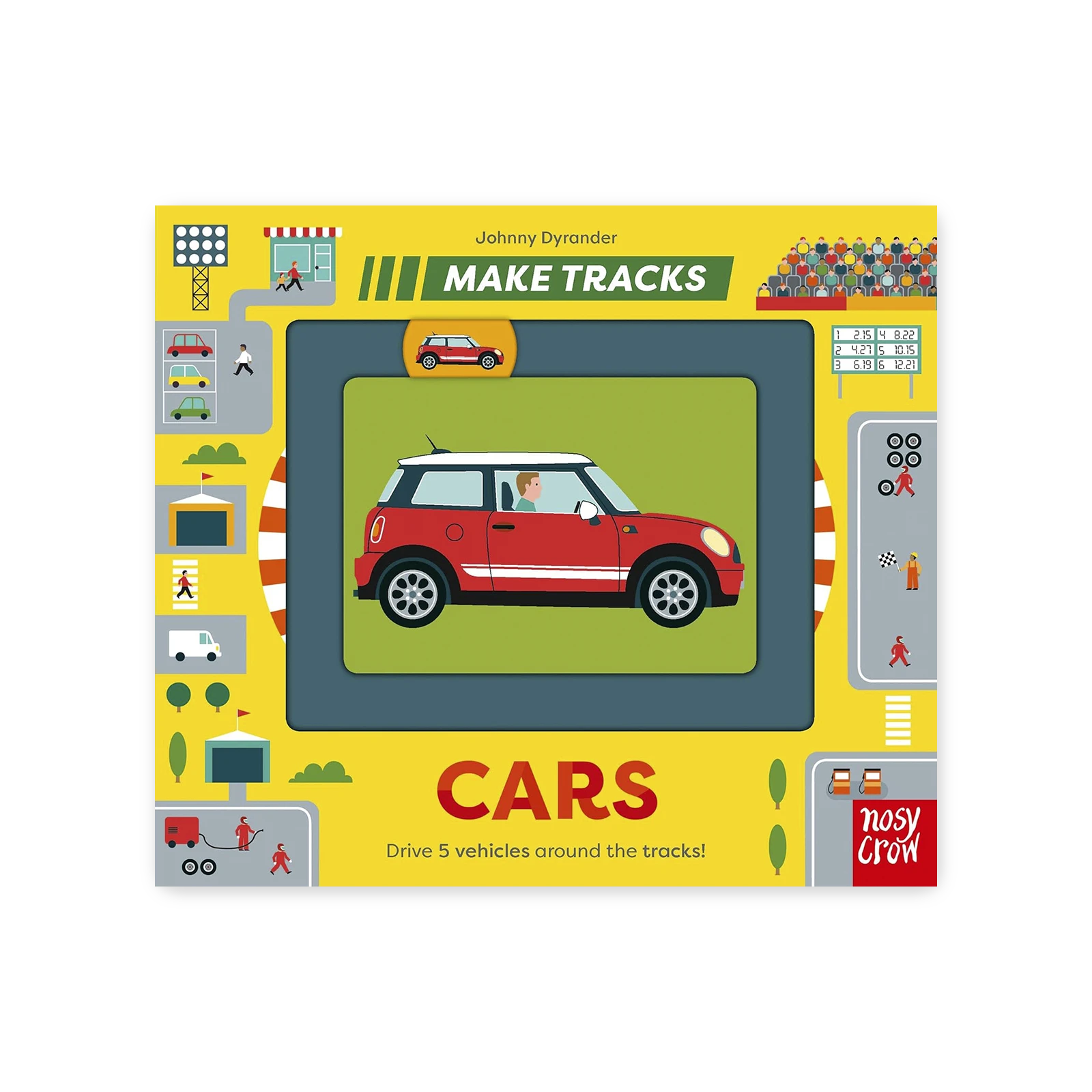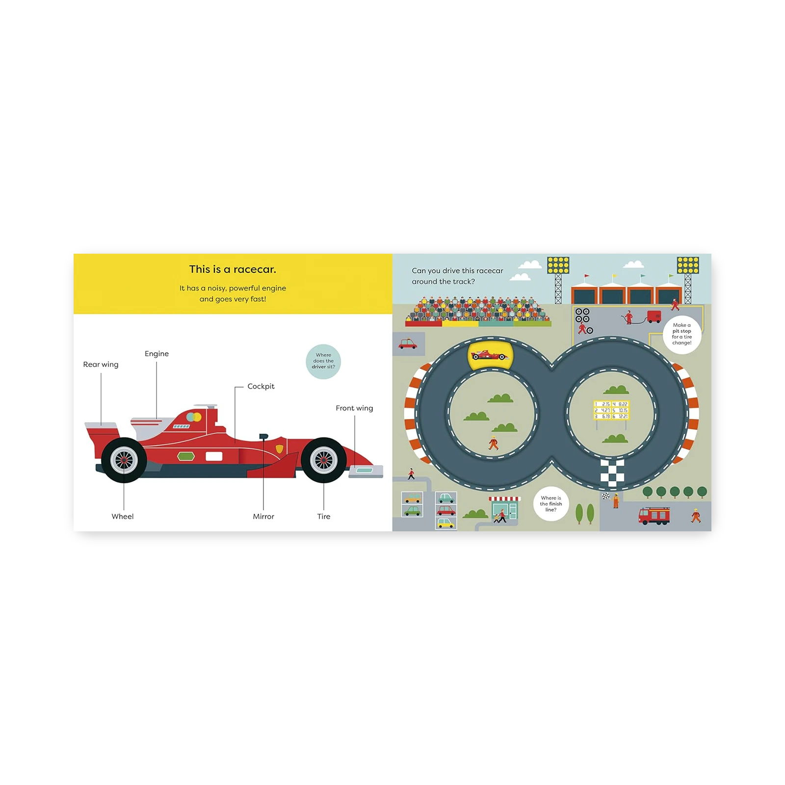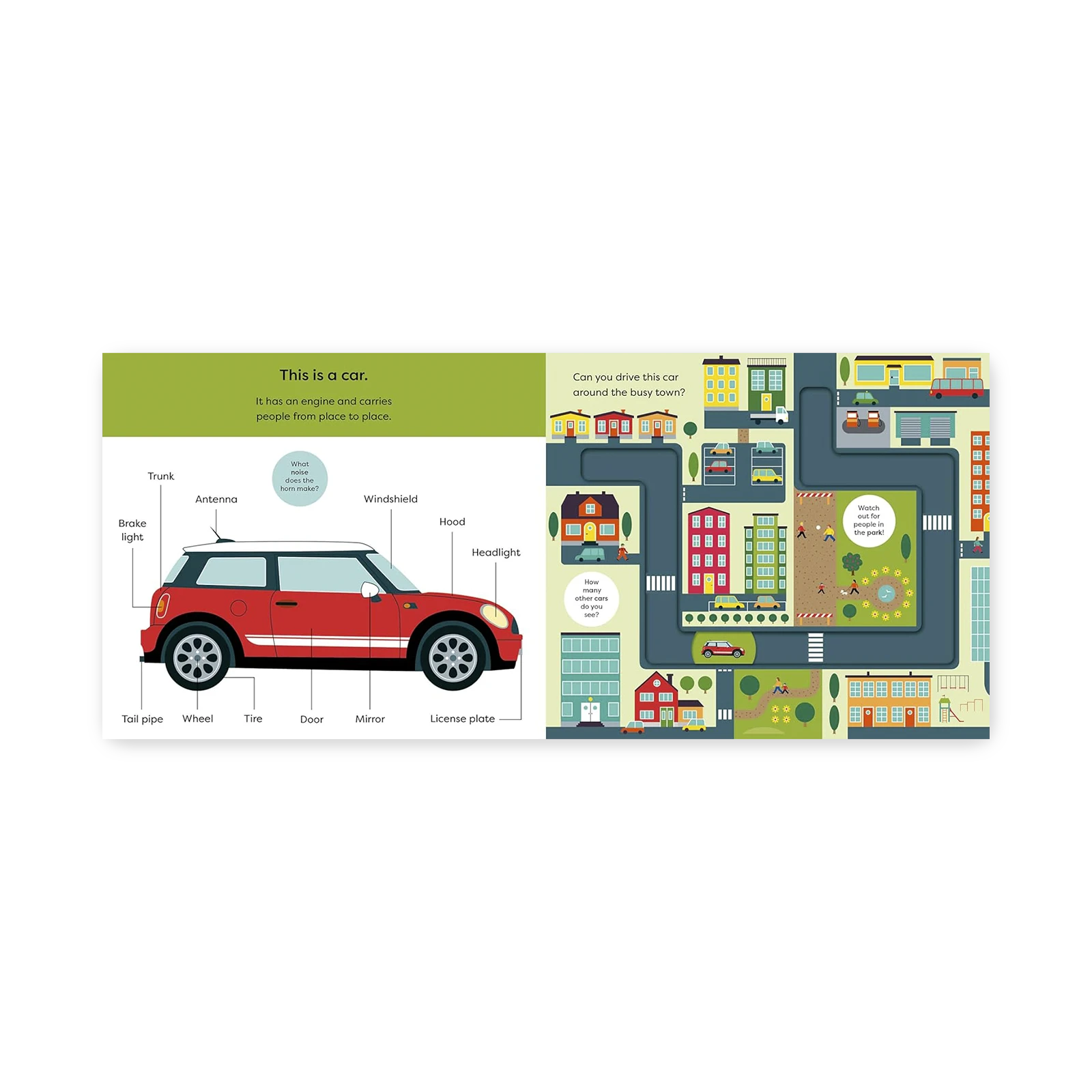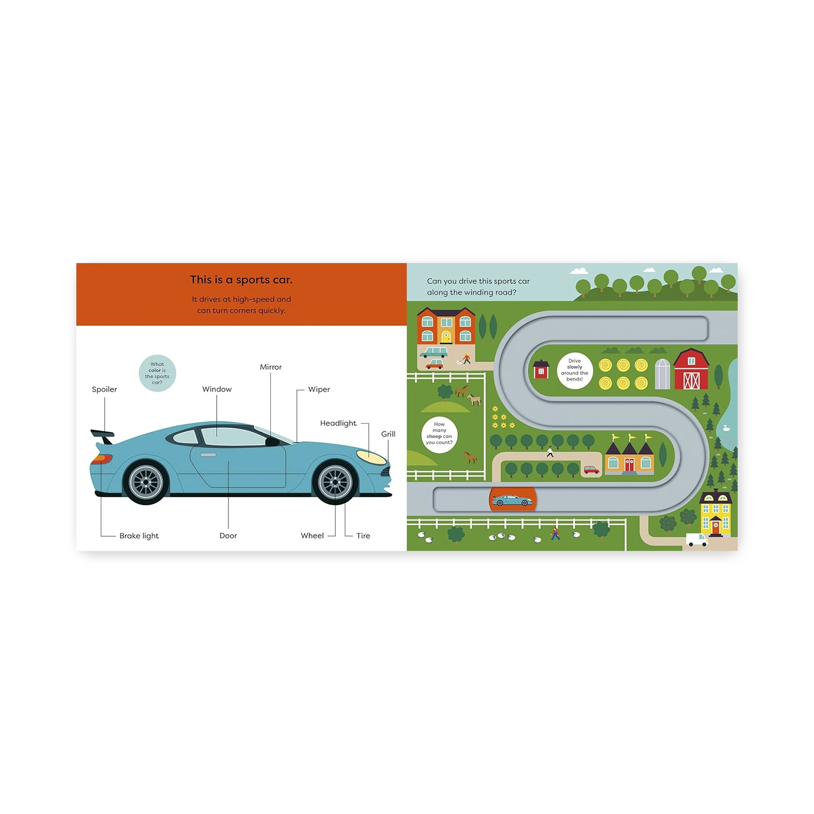 Na każdej stronie znajduje się ruchomy element, który pozwala przesuwać samochód po drodze, objeżdżać zakręty, tankować na stacji benzynowej, a nawet zatrzymać się na światłach. Dziecko nie tylko śledzi trasę auta, ale też aktywnie steruje jego ruchem, rozwijając przy tym motorykę małą i koncentrację.