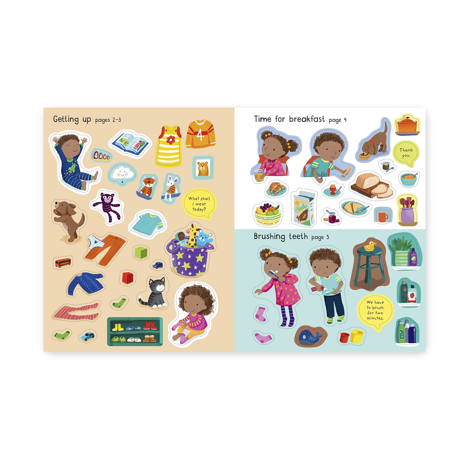Książka „First Sticker Book My Day” zawiera wiele stron, na których dzieci mogą odtwarzać różne aktywności i wydarzenia związane z ich codziennym życiem. Dzięki zestawom naklejek, maluchy mogą ubierać postaci, układać sceny i tworzyć własne opowieści, co sprawia, że nauka staje się fascynującą przygodą.