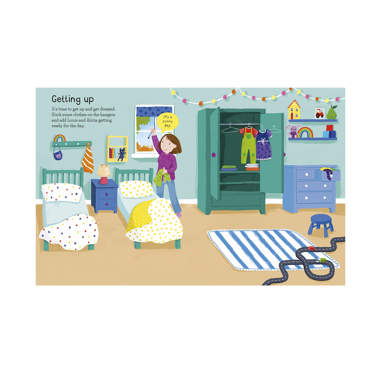 W książce znajdziemy następujące rozdziały: getting up, time for breakfast, brushing teeth, arriving at preschool, coats and bags, playtime, lunchtime, going to the park, bathtime, storytime, bedtime.