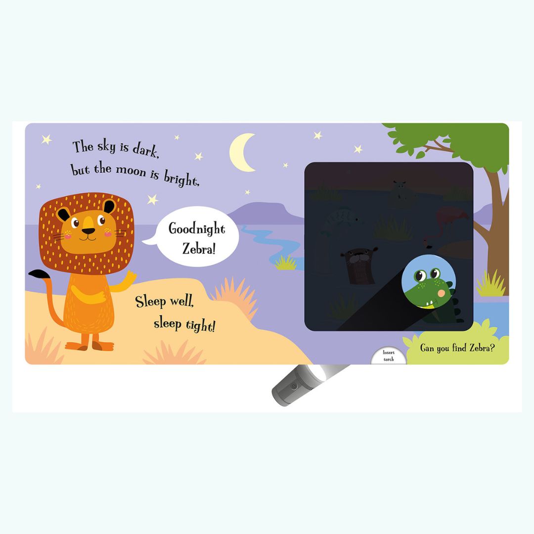 W tej interaktywnej książce dzieci zapoznają się z rymowaną opowieścią, szukając wraz z lewkiem jego przyjaciół – zebry, hipopotama i innych uroczych zwierząt. Wszystko to przy użyciu specjalnej kartonowej latarki, która pozwala odkryć ukryte w ciemności postacie.