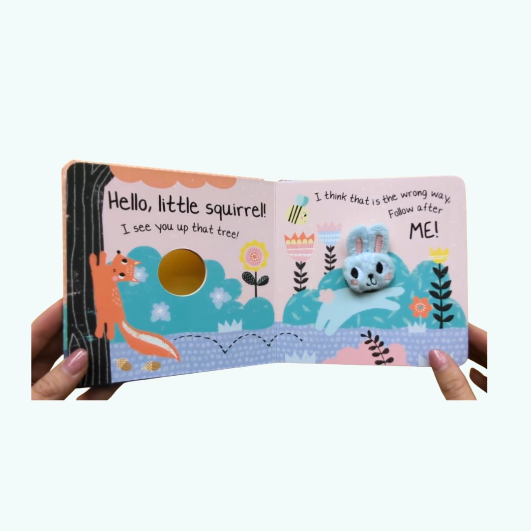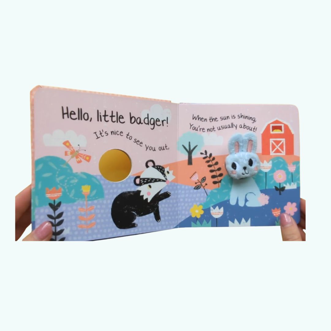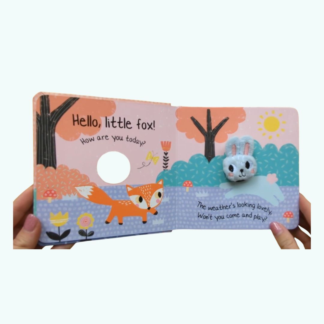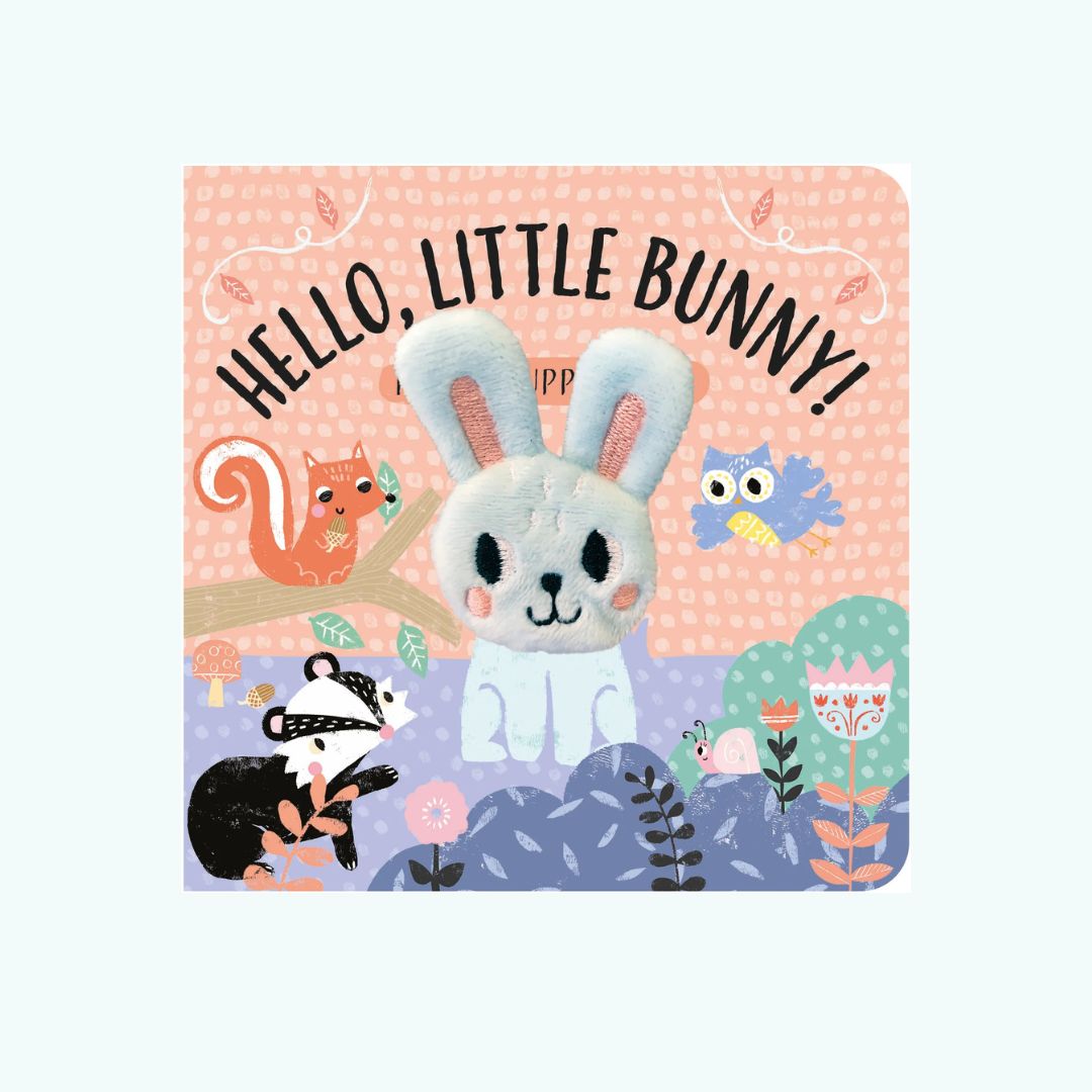 Hello, Little Bunny! to urocza książeczka kartonowa dla najmłodszych, która łączy prostą historyjkę z interaktywną pacynką na palec.