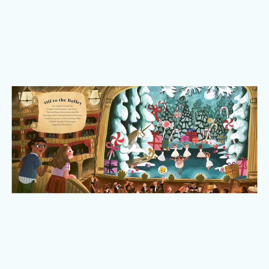 Dzięki wbudowanym przyciskom dźwiękowym czytelnicy mogą posłuchać fragmentów muzyki w wykonaniu orkiestr, chórów i tradycyjnych kolędników. Książka łączy zabawę, naukę i magię dźwięku, wprowadzając dzieci w świat klasycznych melodii świątecznych w przystępny, pełen uroku sposób.