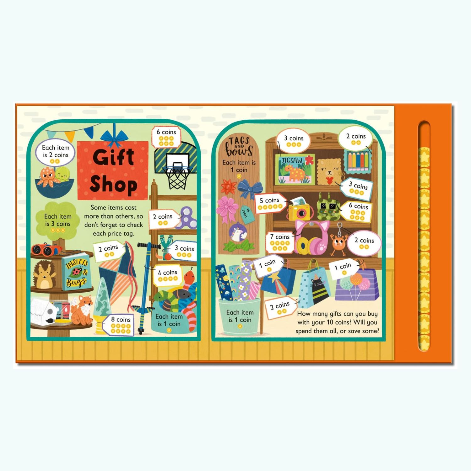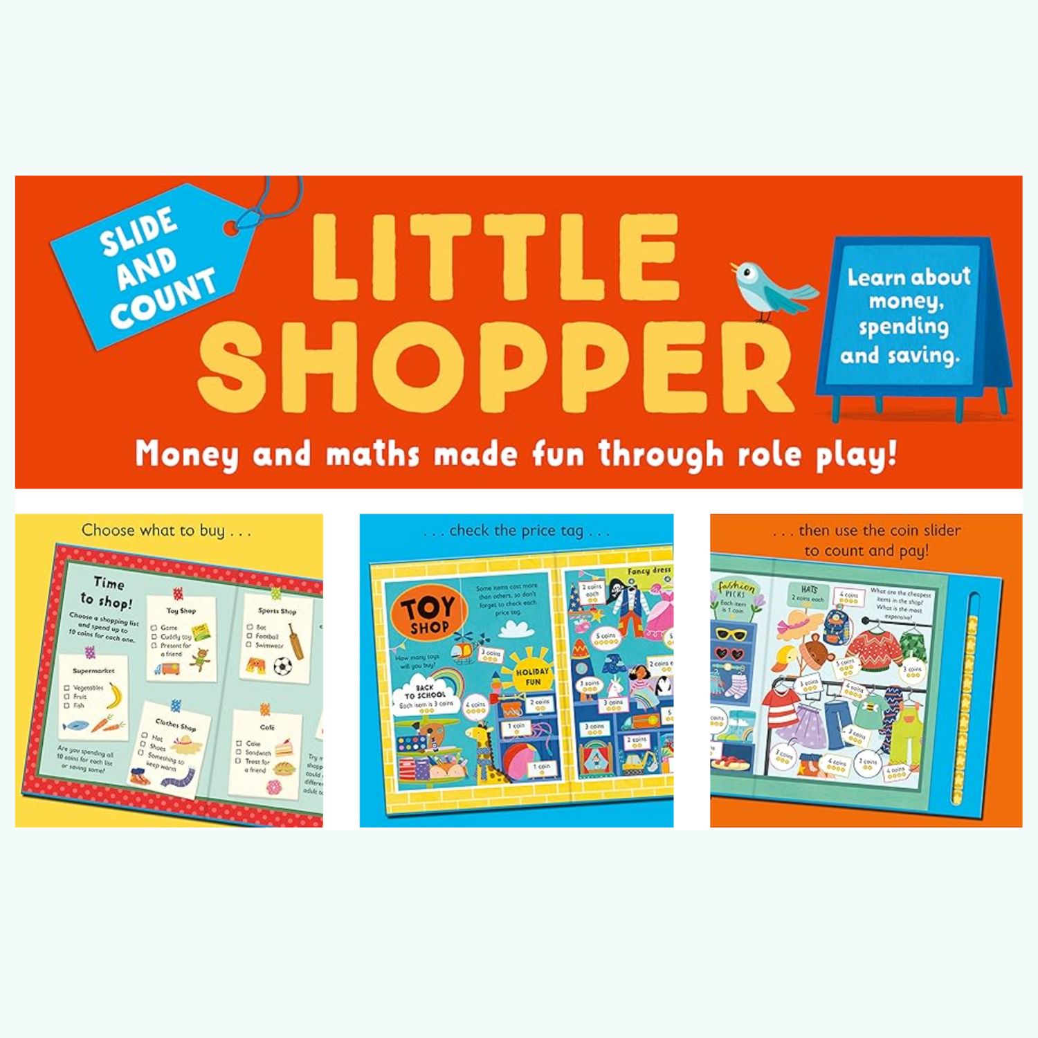 Dzięki interaktywnym elementom książka rozwija umiejętności liczenia, logiczne myślenie oraz motorykę małą, jednocześnie ucząc dzieci podstaw gospodarowania pieniędzmi.