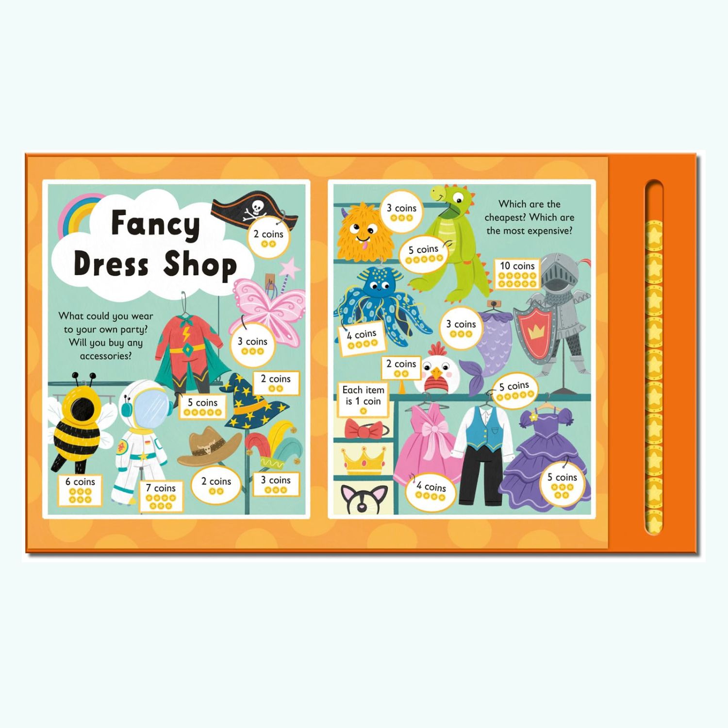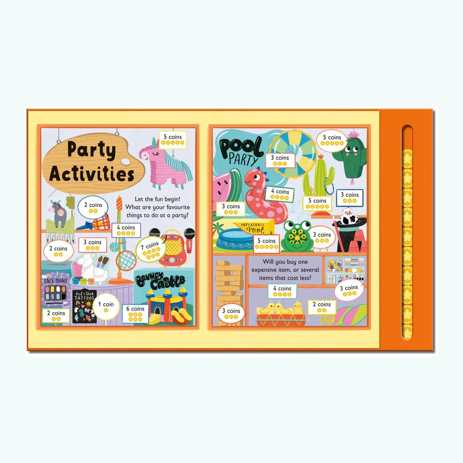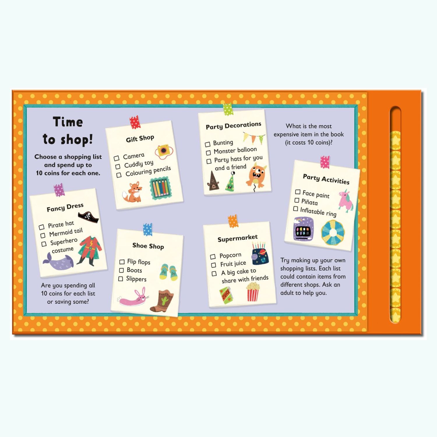 Podczas lektury mali czytelnicy wybierają listę zakupów, odwiedzają różne sklepy i decydują, co kupić na przyjęcie. Na każdej stronie mogą sprawdzić ceny produktów, a następnie użyć ruchomego suwaka z monetami, aby zapłacić za wybrane rzeczy i sprawdzić, ile pieniędzy zostało.
