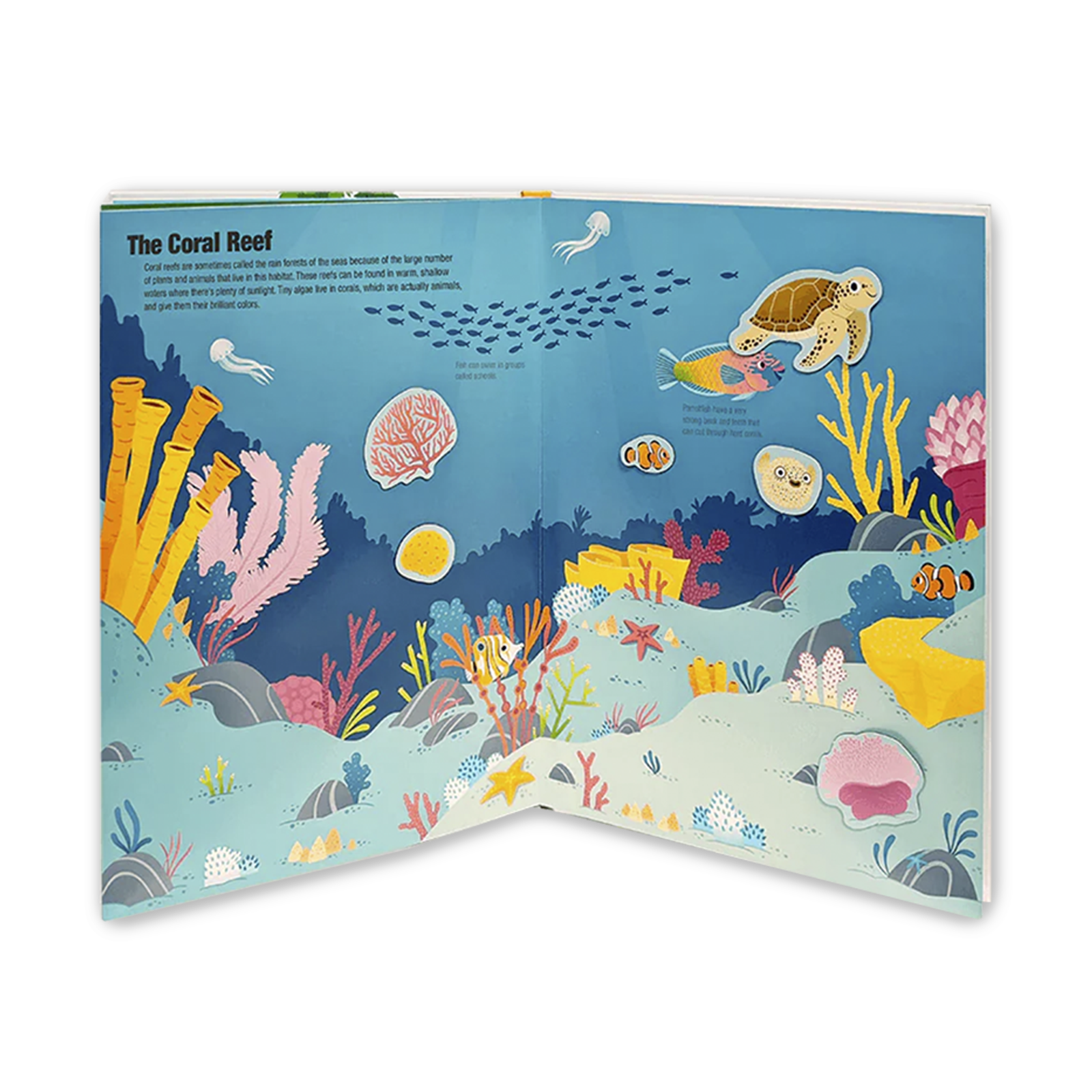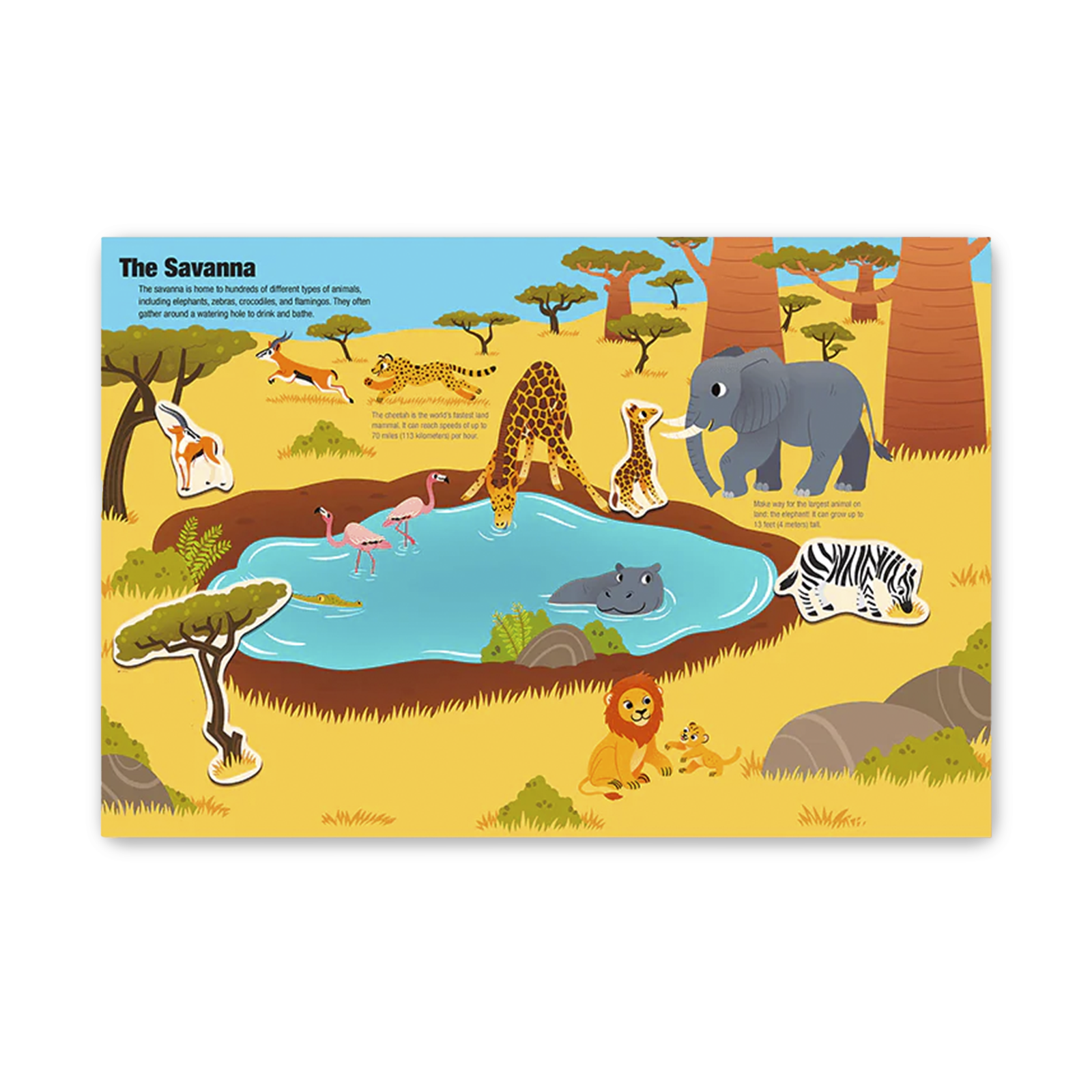 Każda strona książki jest namagnesowana, co pozwala na łatwe i bezpieczne umieszczanie i przesuwanie elementów, co stymuluje kreatywność i wyobraźnię dzieci. Sceny obejmują różnorodne środowiska naturalne, takie jak las deszczowy, sawanna, rafa koralowa i lodowe krajobrazy, dając dzieciom możliwość poznania życia zwierząt w ich naturalnych siedliskach.
