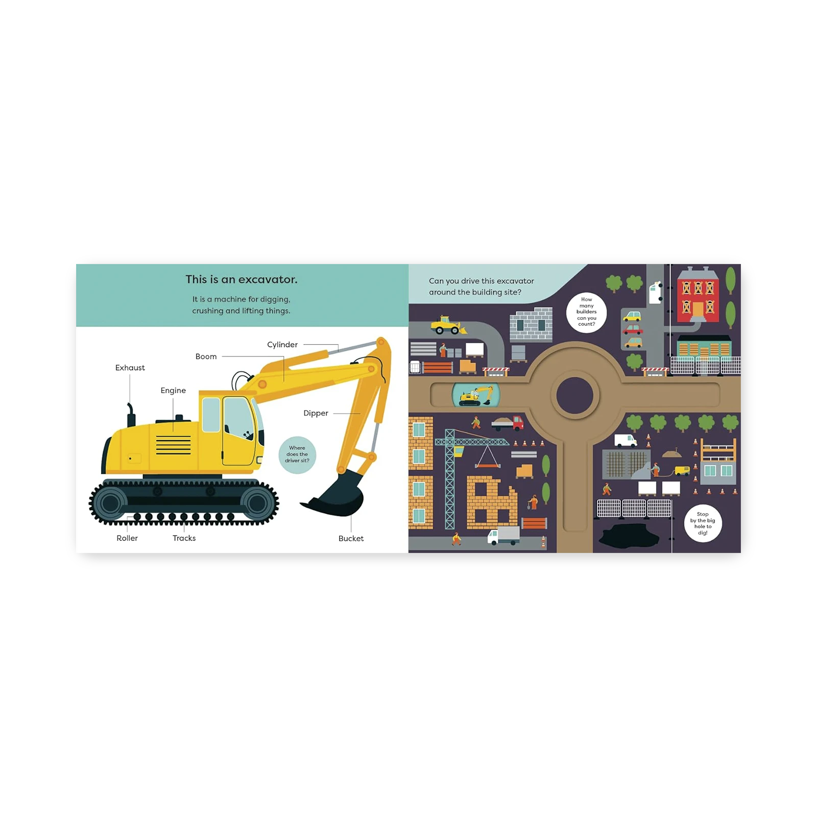 Interaktywne trasy do śledzenia palcem – dzieci mogą „jeździć” po stronach jak po prawdziwym placu budowy.