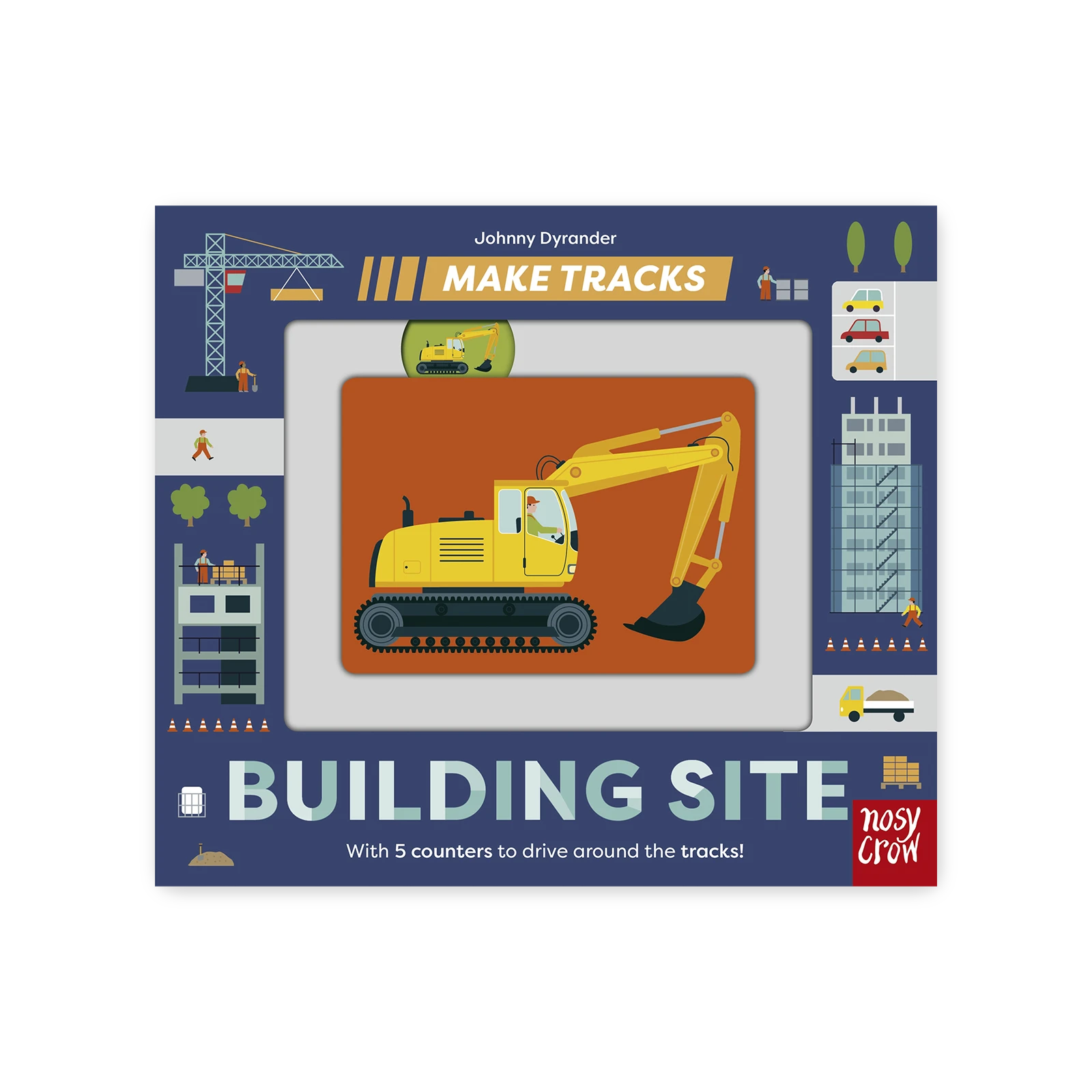 Czas ruszyć na plac budowy! W książce „Make Tracks: Building Site” mali czytelnicy mogą „prowadzić” koparki, dźwigi i betoniarki, śledząc ich trasy palcem po specjalnie zaprojektowanych torach.