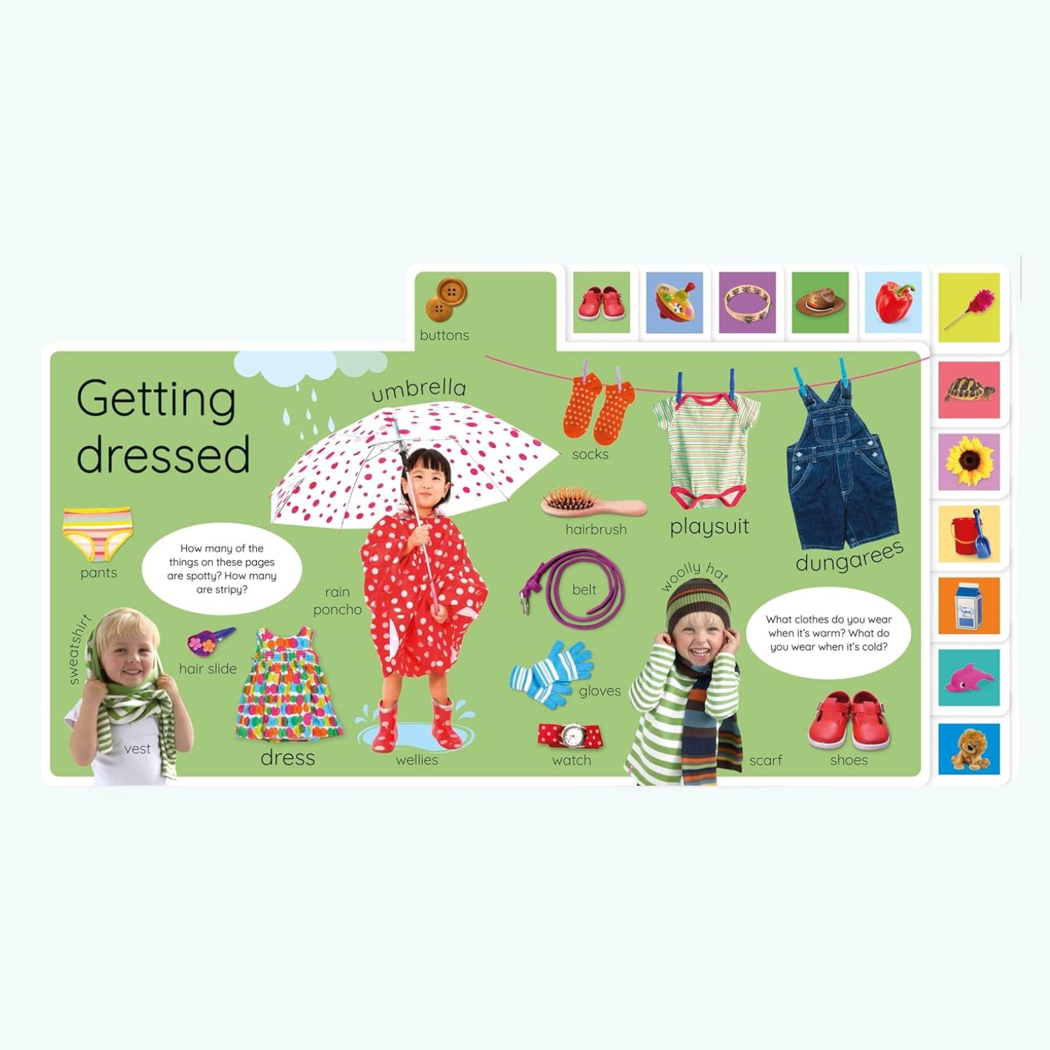 Każda strona zawiera jasne, kolorowe ilustracje z podpisami, które zachęcają dzieci do wymawiania pierwszych słów, a pytania na stronach pomagają rozwijać spostrzegawczość i zdolności językowe. Dzięki 13 zakładkom maluchy mogą łatwo przewracać strony i odkrywać różne sceny – od zabawy z kociętami, przez szukanie czerwonych i zielonych przedmiotów w ogrodzie po wieczorną rutynę.
