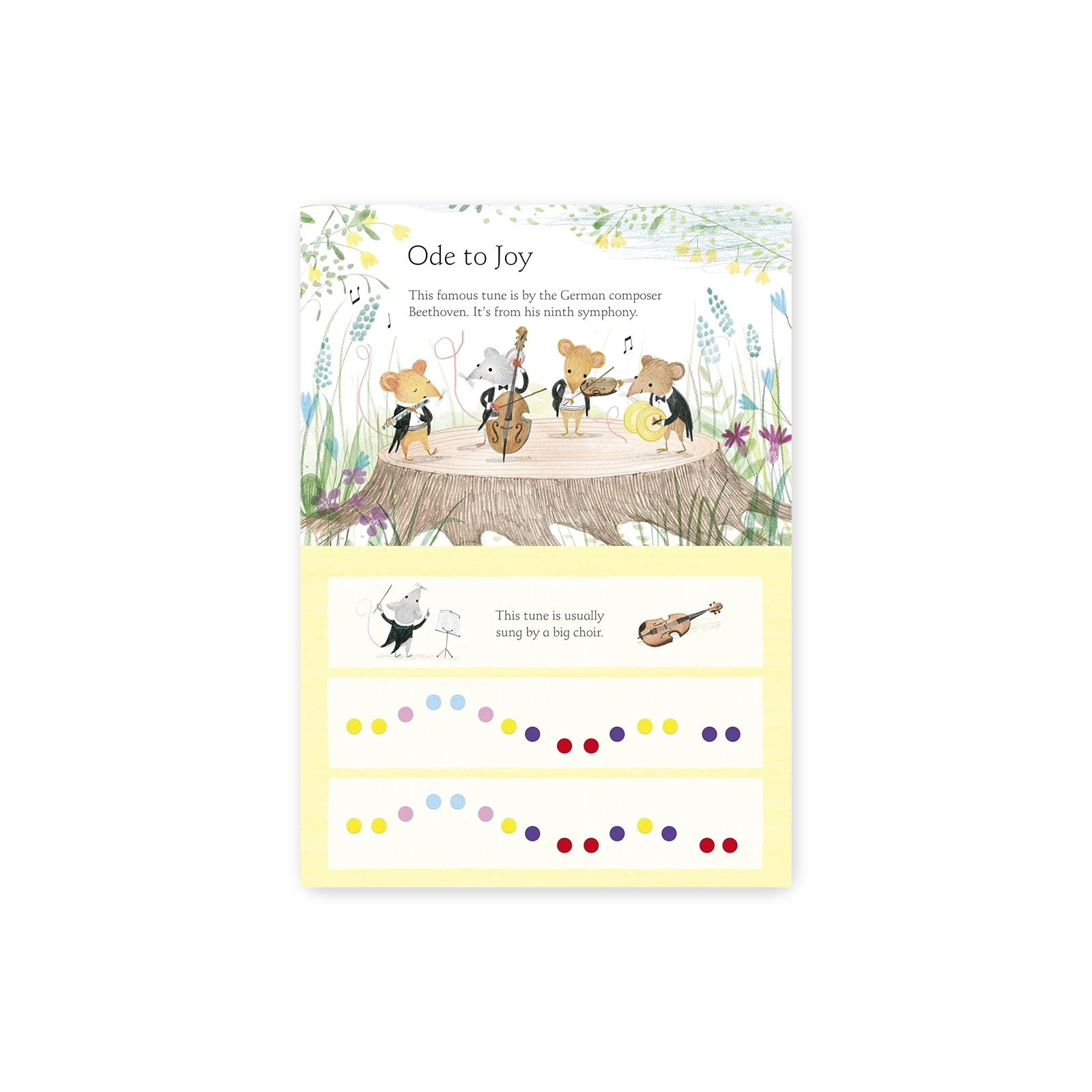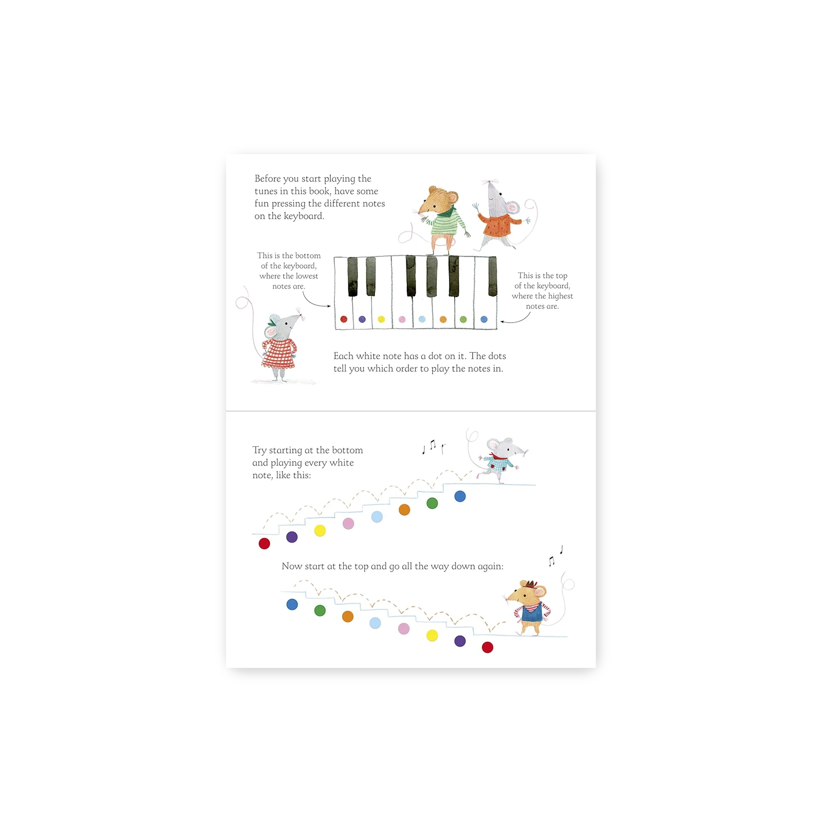 Kolorowe przyciski – każdy dźwięk w książce oznaczony jest kolorem, który odpowiada jednemu z klawiszy na keyboardzie. Dzięki temu dzieci mogą grać melodie intuicyjnie i samodzielnie.