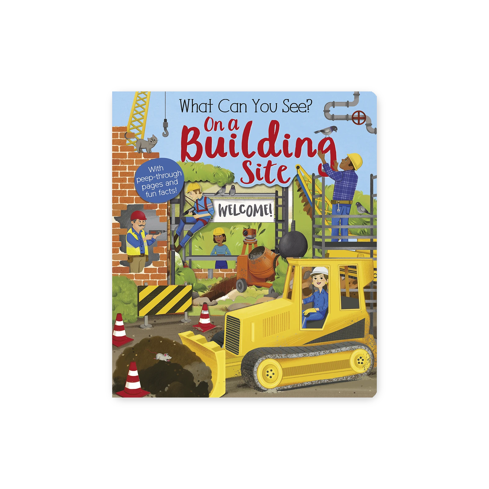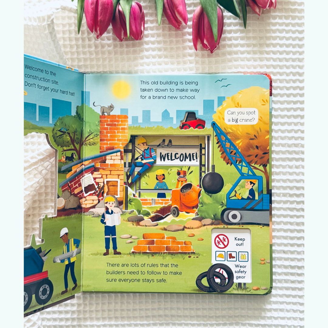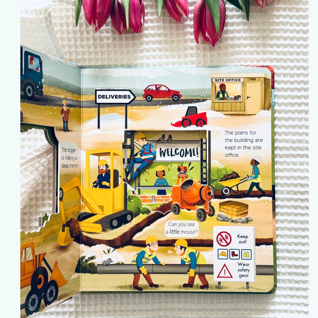 What Can You See? On a Building Site to niezwykle wciągająca książeczka kartonowa, która zabiera najmłodszych czytelników na tętniący życiem plac budowy. Przez specjalne wycięcia w stronach dzieci mogą zaglądać do środka i odkrywać, co robią koparki, dźwigi, betoniarki i inni „bohaterowie” tej budowlanej przygody.