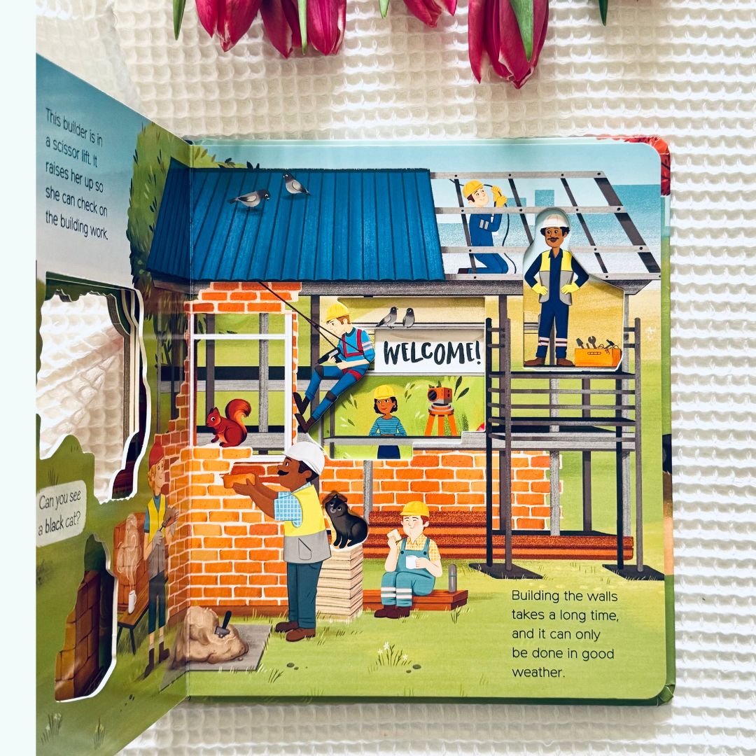 To świetna propozycja dla maluchów zafascynowanych pojazdami, maszynami i pracą ludzi, którzy budują domy, mosty czy wieżowce. Dzięki prostym zdaniom w języku angielskim i kolorowym ilustracjom, książeczka uczy nazw maszyn, zawodów i czynności związanych z budownictwem – w sposób lekki i przystępny.
