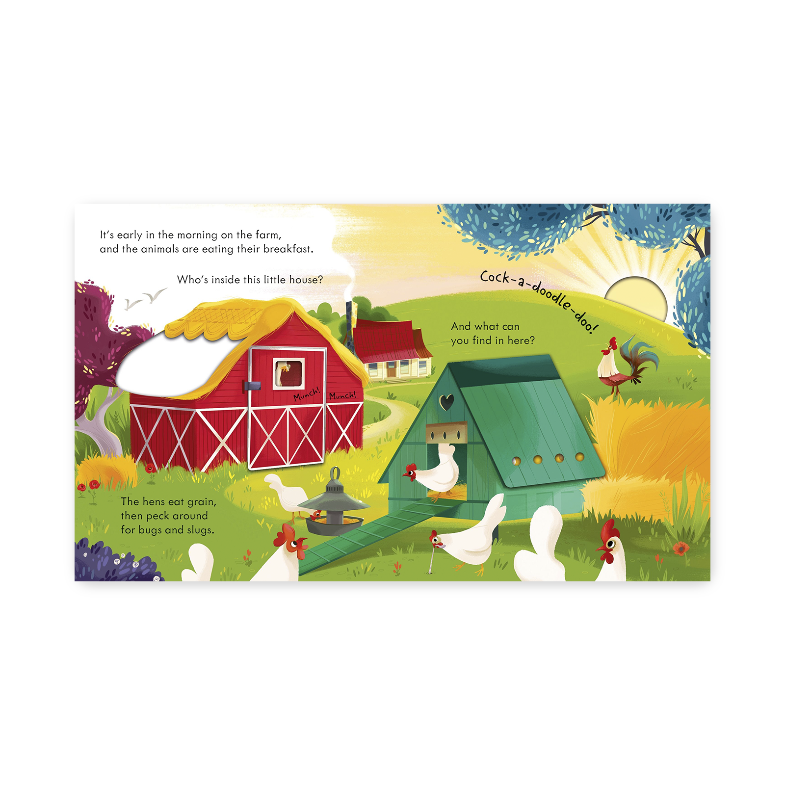Otwierane okienka: Dzieci mogą zajrzeć przez otwierane okienka, aby odkryć, co kryje się w stodołach, kurnikach i na polach. Każde okienko odsłania nowe, interesujące szczegóły, które zachwycą małych odkrywców.