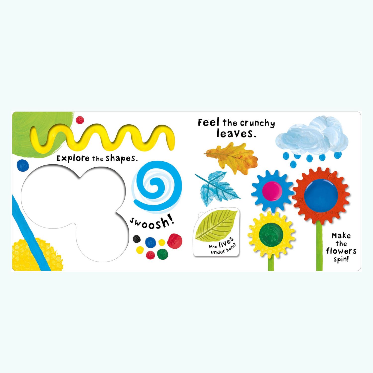 Na każdej stronie czekają różnorodne elementy do odkrycia: wypukłe i chropowate faktury, ruchome części do przesuwania, kółka do obracania oraz intensywne, przyciągające wzrok kolory. Dzięki temu książka angażuje wiele zmysłów jednocześnie i zapewnia dziecku długą, rozwijającą zabawę.