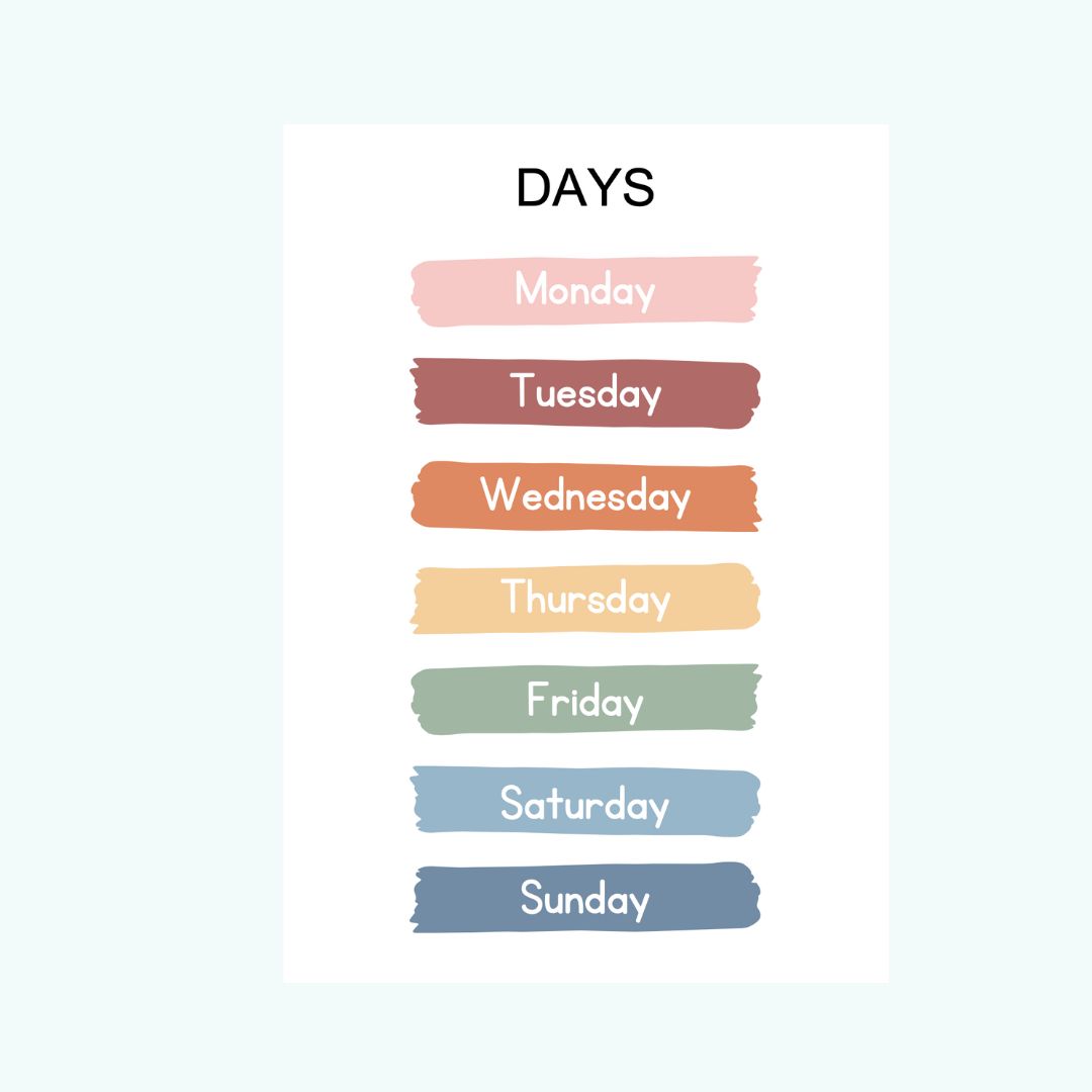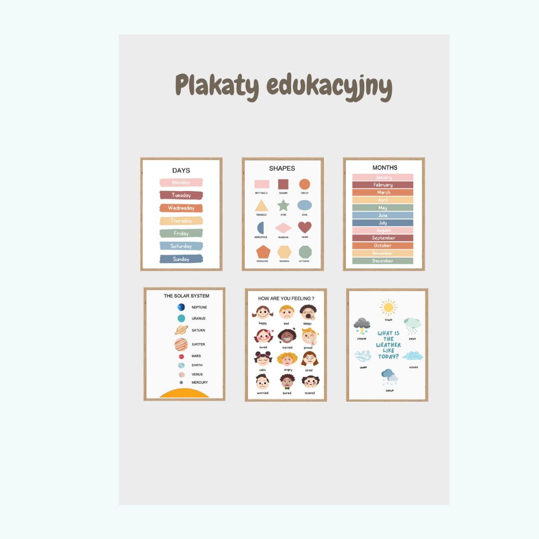 Kolorowe plansze wspierające naukę podstawowych pojęć, takich jak: dni tygodnia, kształty, miesiące, emocje, pogoda, przestrzeń kosmiczna. Doskonałe do zawieszenia w pokoju dziecka lub w kąciku językowym.