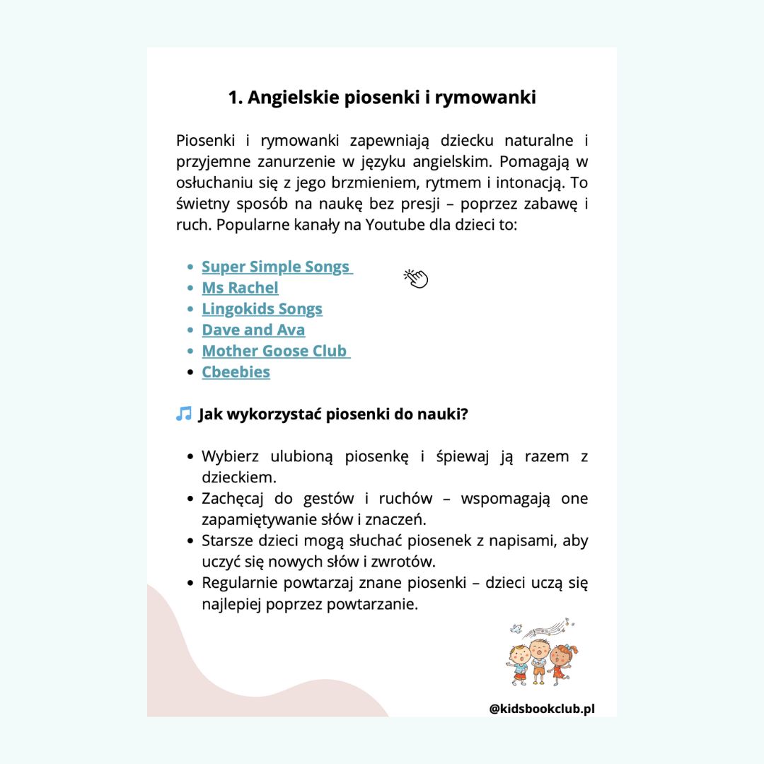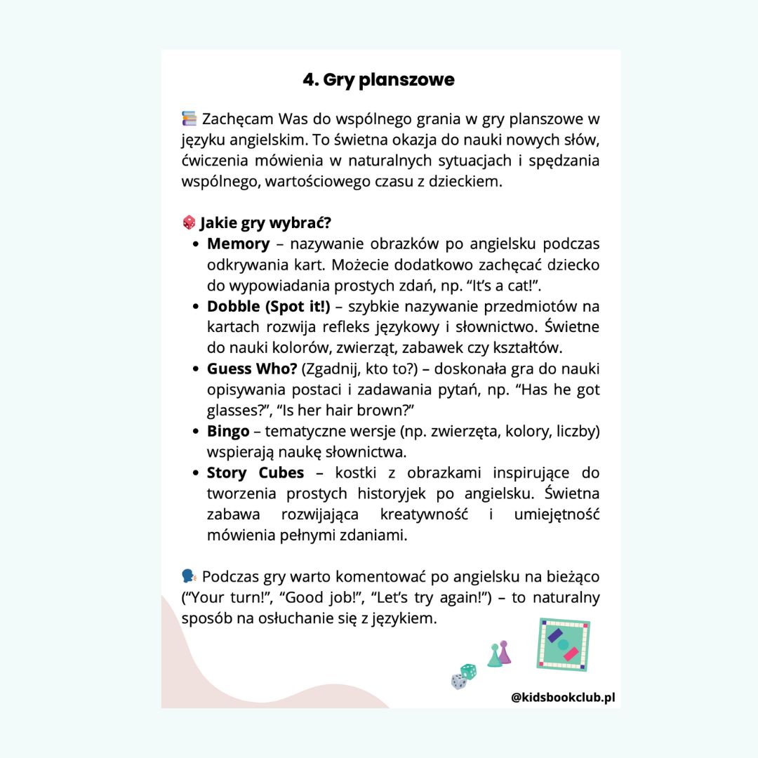 Praktyczne wskazówki, jak wspierać naukę języka angielskiego w domowym środowisku – z wykorzystaniem piosenek i rymowanek, codziennych zwrotów, książek, gier planszowych, bajek, aplikacji i materiałów edukacyjnych.