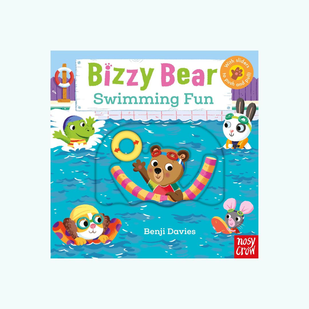 W książce Bizzy Bear: Swimming Fun maluchy towarzyszą misiowi podczas zajęć na pływalni.