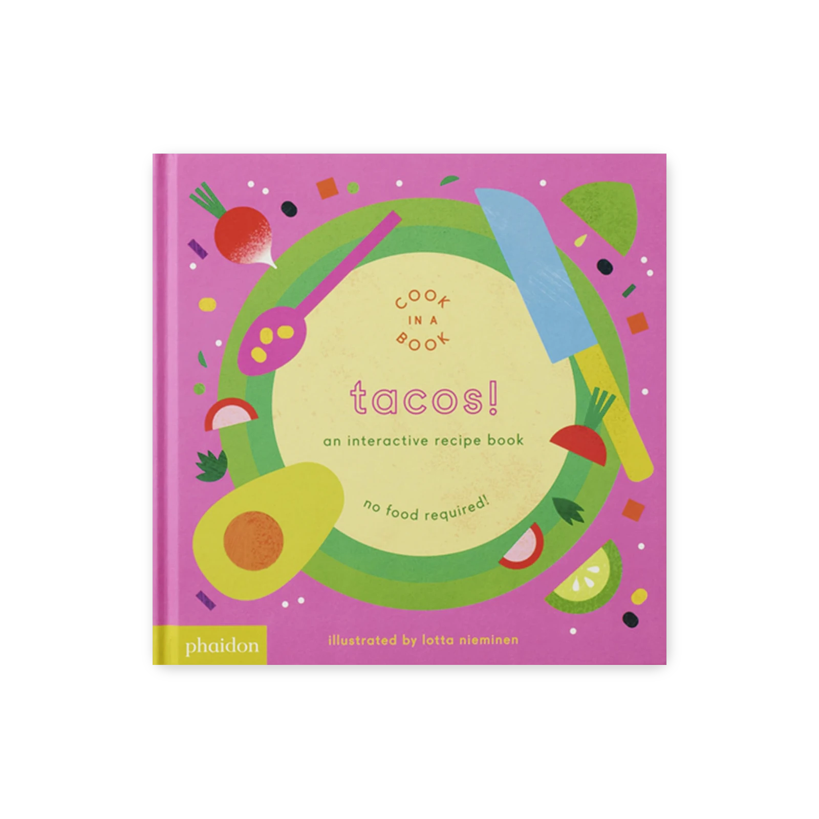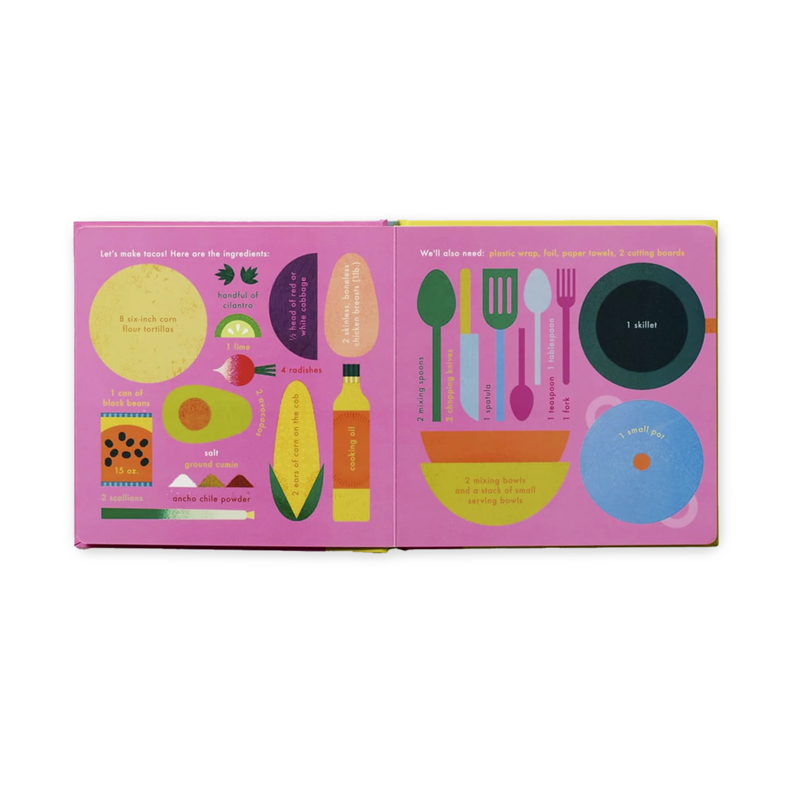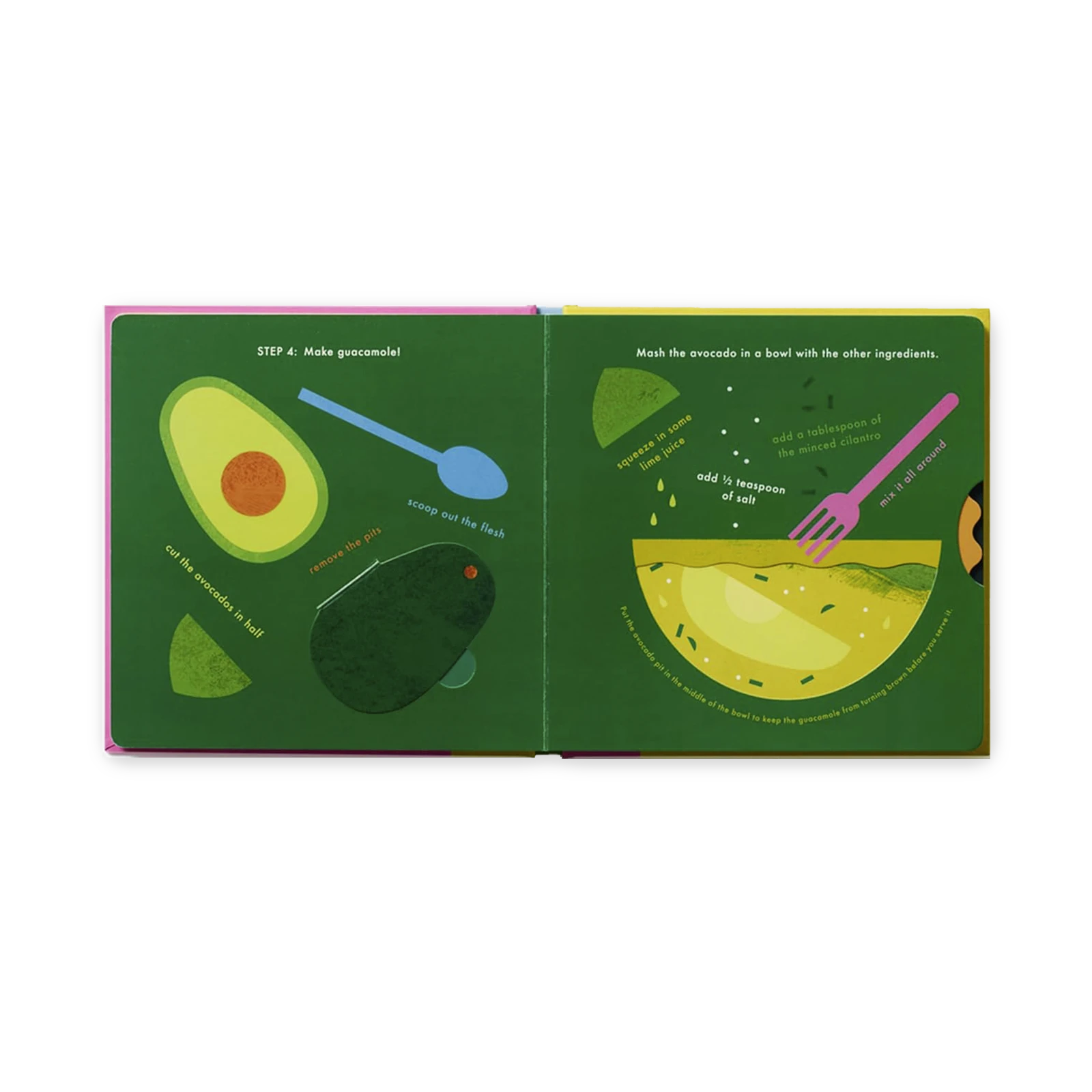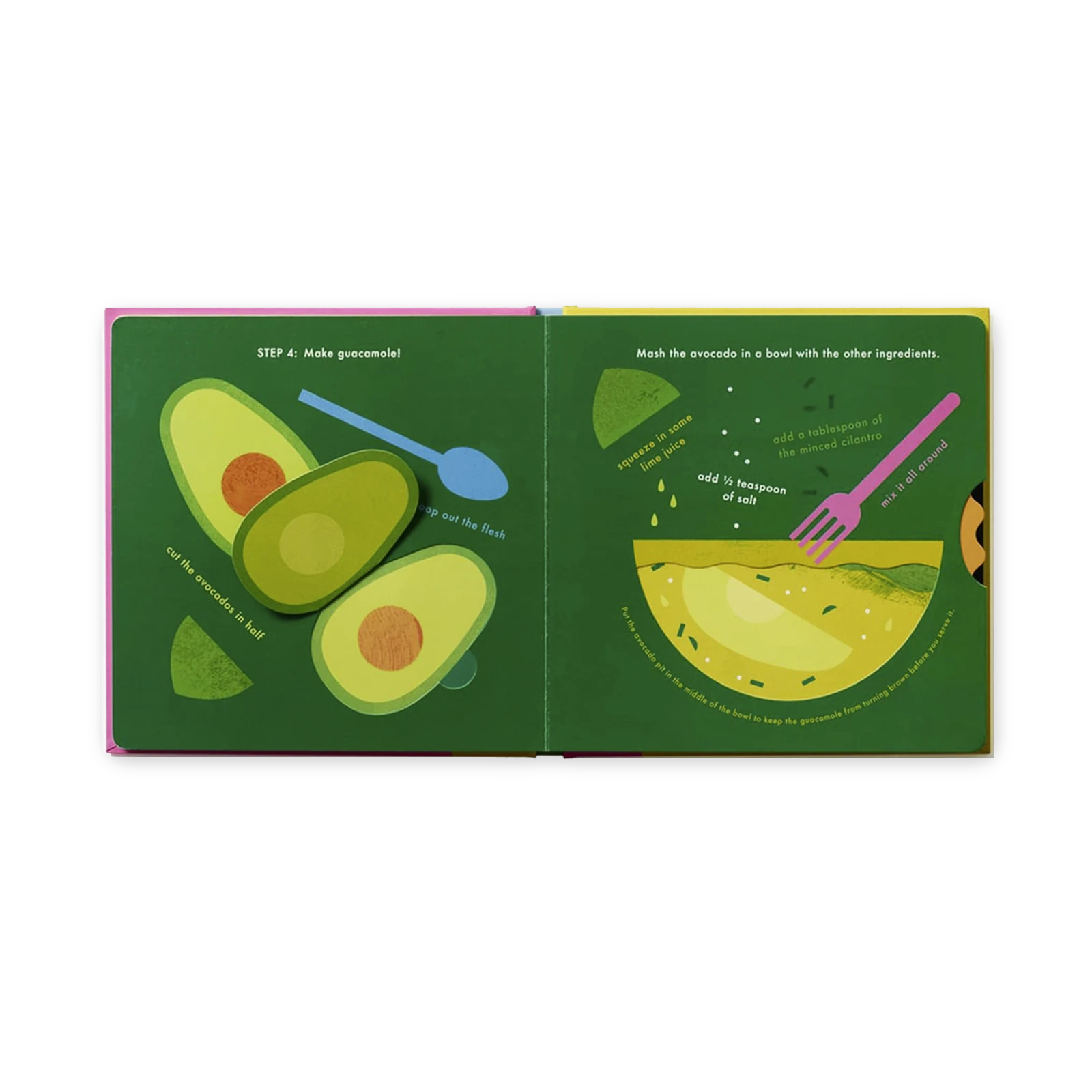 For kids who cook in a play kitchen or a real kitchen, this interactive recipe book invites readers to chop the vegetables, mash the avocado, warm the tortillas, and more – all inside the book!
