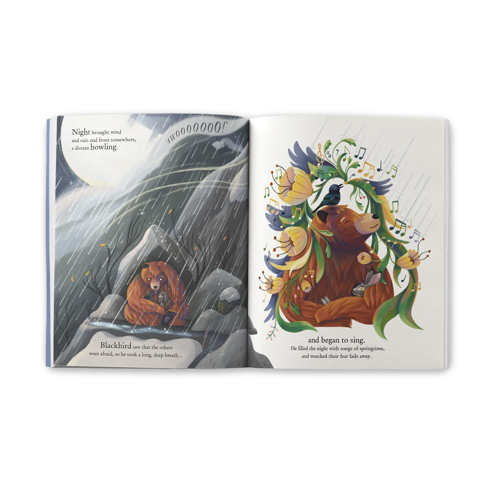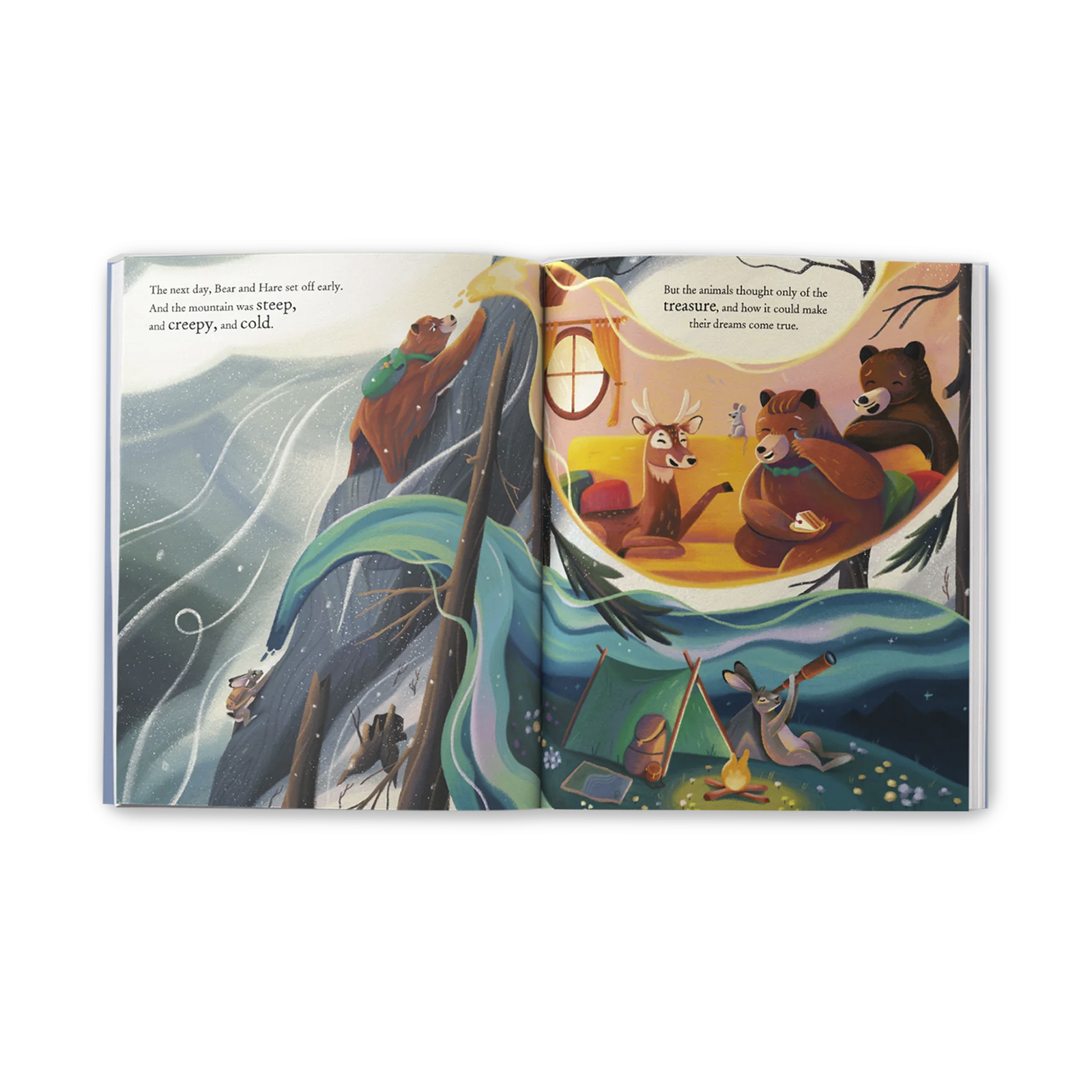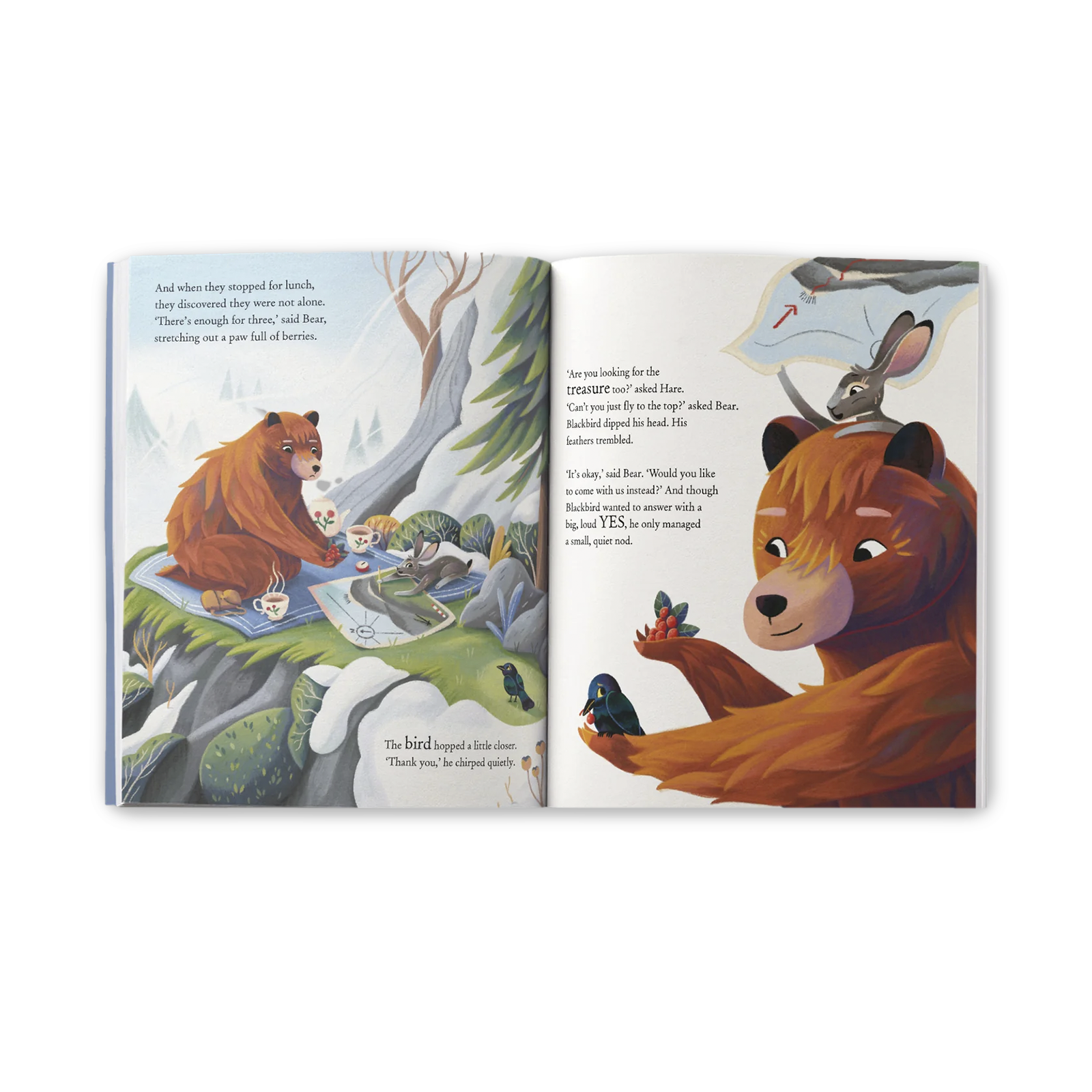Książka opowiada historię Zajączka, który wyrusza na poszukiwanie legendarnego skarbu ukrytego na szczycie ciemnej, zimnej góry. Podczas swojej podróży spotyka Niedźwiedzia, który marzy o znalezieniu przyjaciół, oraz Ptaka, który pragnie przezwyciężyć swoją nieśmiałość. Gdy w końcu docierają na szczyt i odkrywają skarb, zdają sobie sprawę, że prawdziwe bogactwo już znaleźli.