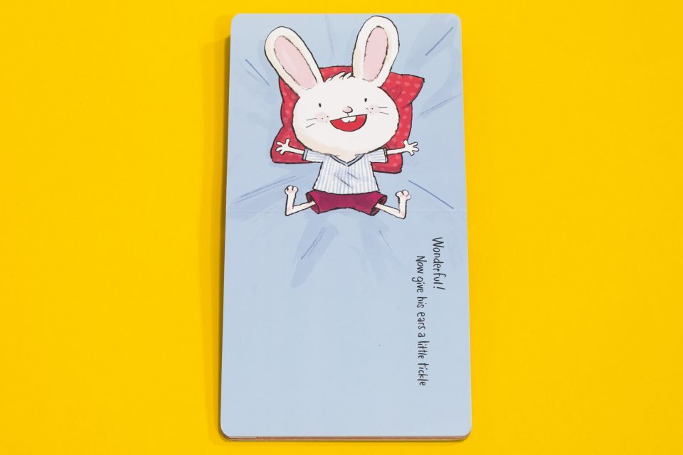 Książka Tickle my ears to światowy bestseller dla maluszków. To urocza i prosta książeczka, która zaprasza dzieci do udziału w wieczornym rytuale Króliczka poprzez pomoc w przygotowaniu do snu za pomocą zabawy na każdej stronie.