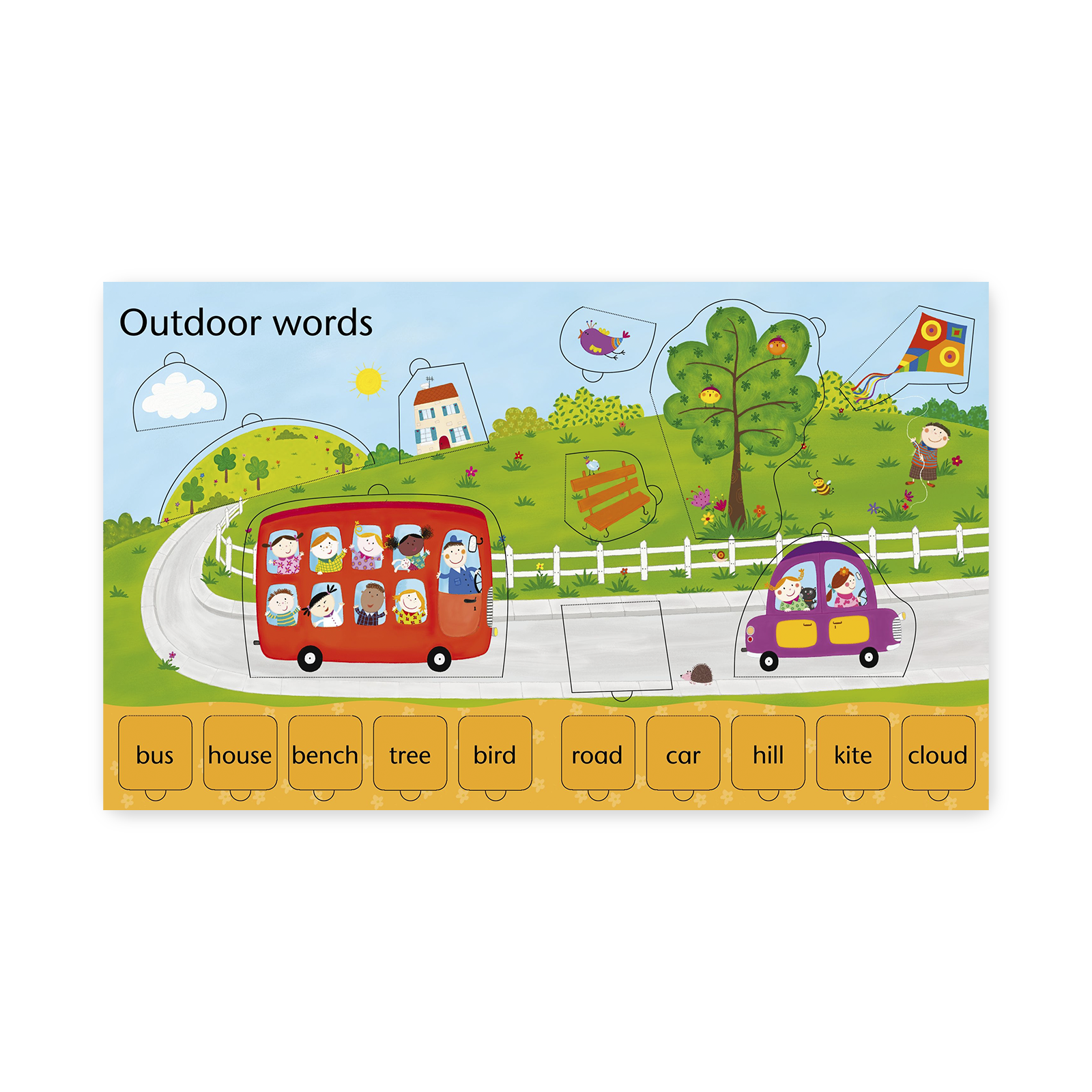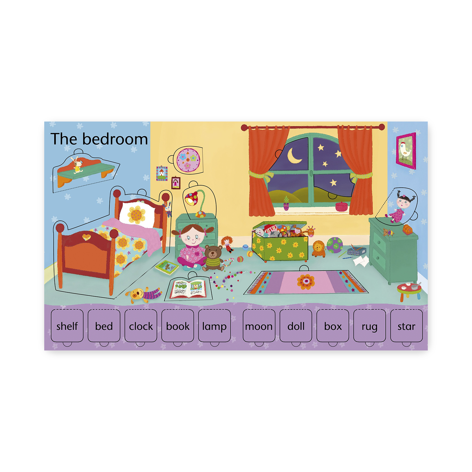 Książka zawiera aż 120 otwieranych okienek, pod którymi mali odkrywcy znajdą 70 podstawowych słów pogrupowanych tematycznie: on the farm, in the park, my body and clothes, outdoor words, on the beach, noisy words, the bedroom .